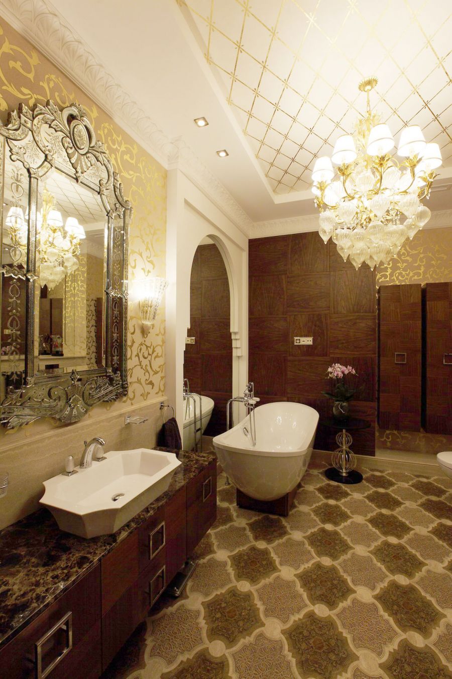 Пример с элементами дворцовой стилистики – золотистый узор на обоях и потолке как дополнение к богатой доминанте.