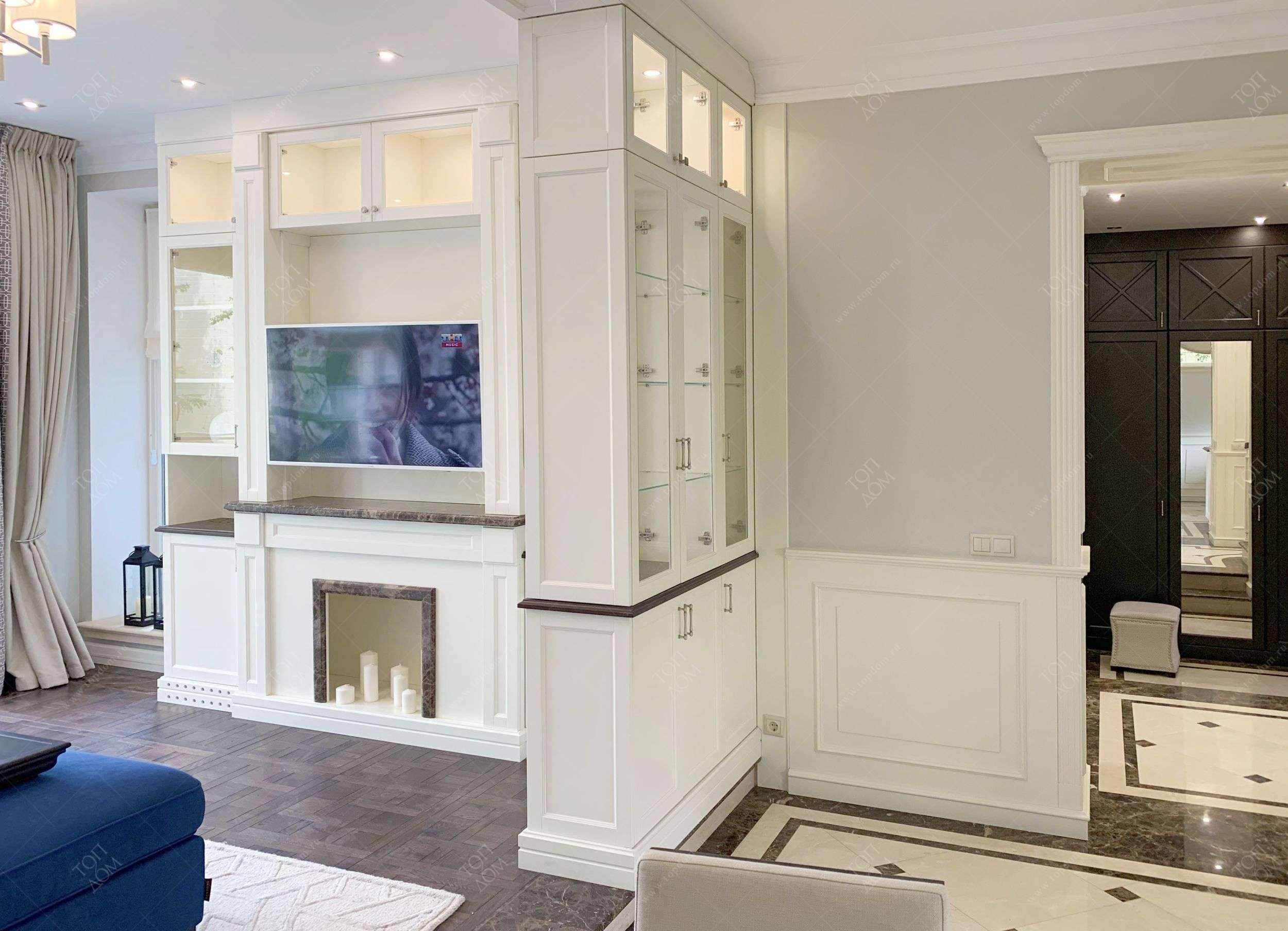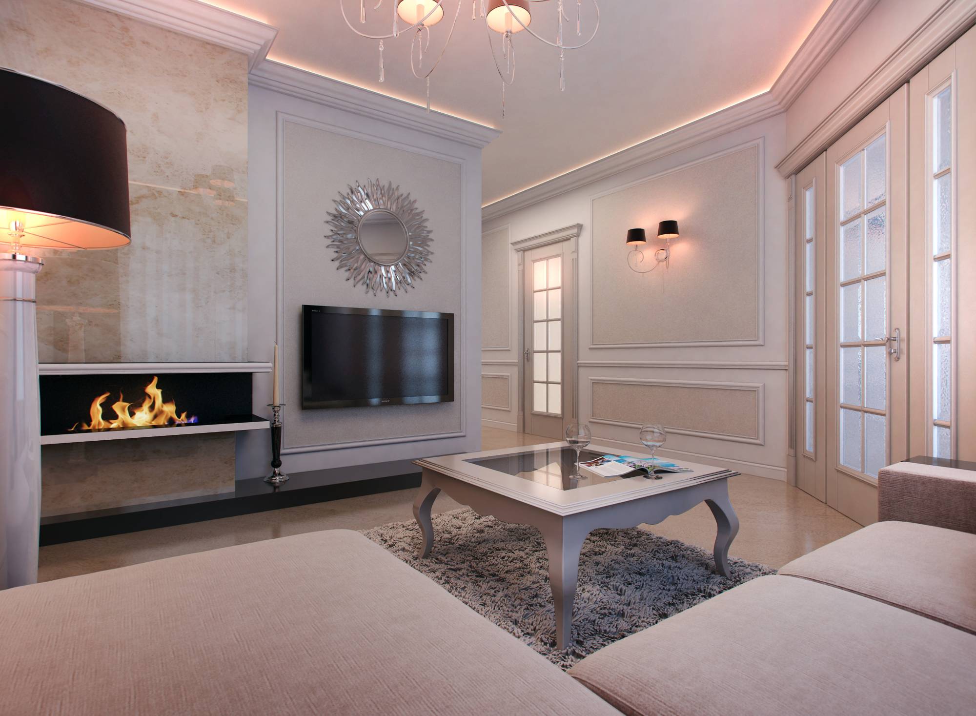 Планировка гостиной усложняется асимметрией комнаты. Именно поэтому в качестве базовой здесь лучше использовать бежевую гамму. Украшенные молдингами стены, подсвеченный потолок, угловой диван формируют единое светлое пространство, в котором выигрышно взаимодействуют кофейные оттенки – шторы, светильники, подиум для декоративного камина.