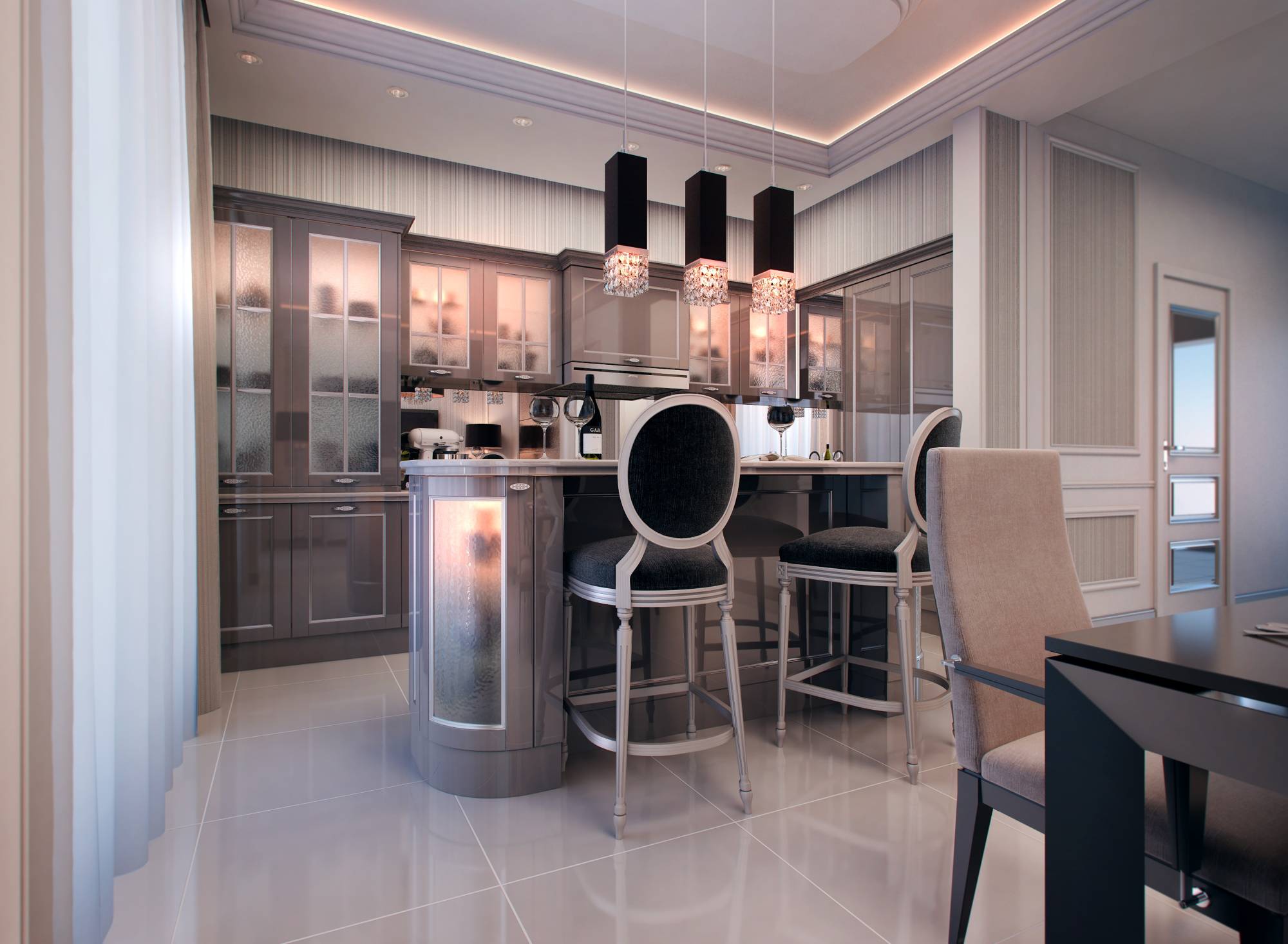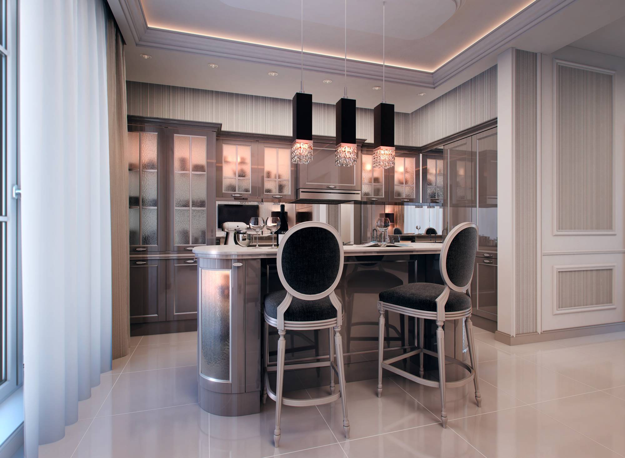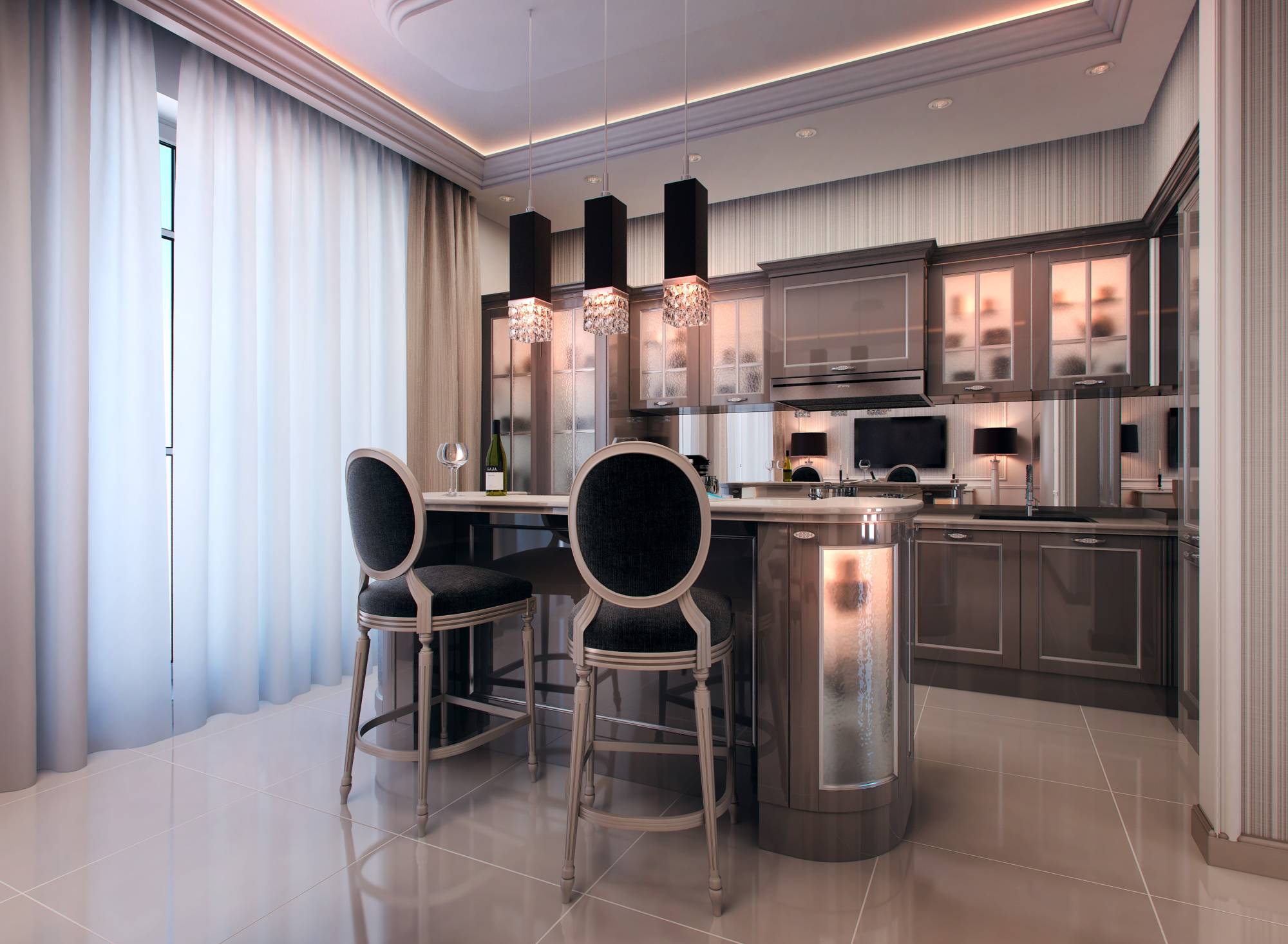 Остров, совмещенный с барной стойкой, вынесен к центру помещения. В боковых стойках сделаны шкафчики для хранения, тоже с подсветкой. Коричневая обивка барных стульев – самый плотный цвет в кухонной зоне, поддержанный дизайном светильников для «островом».