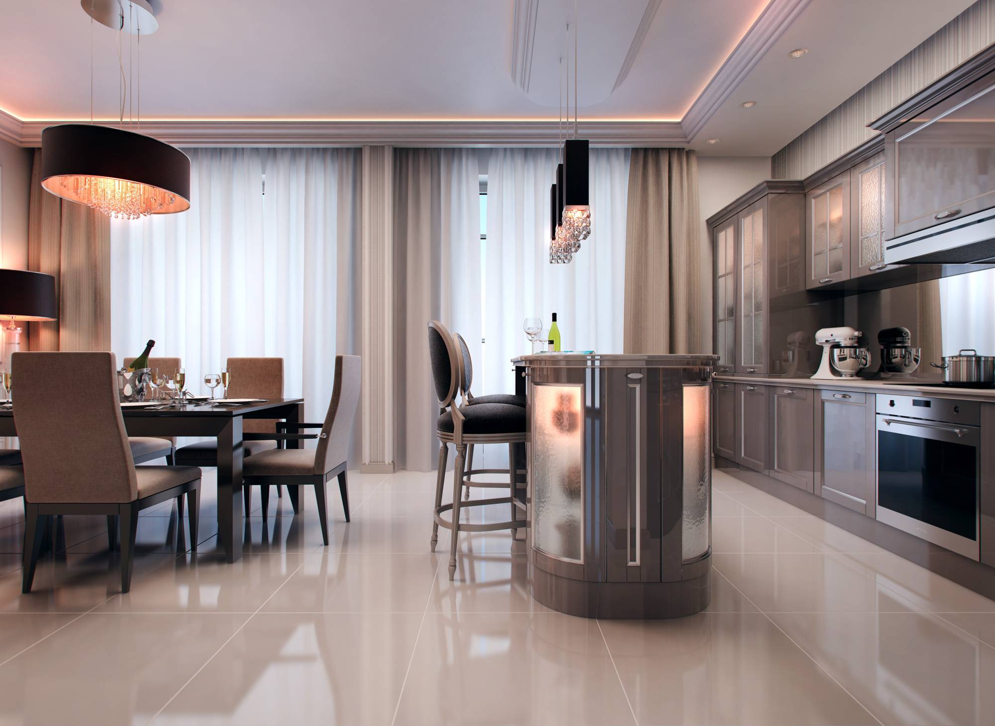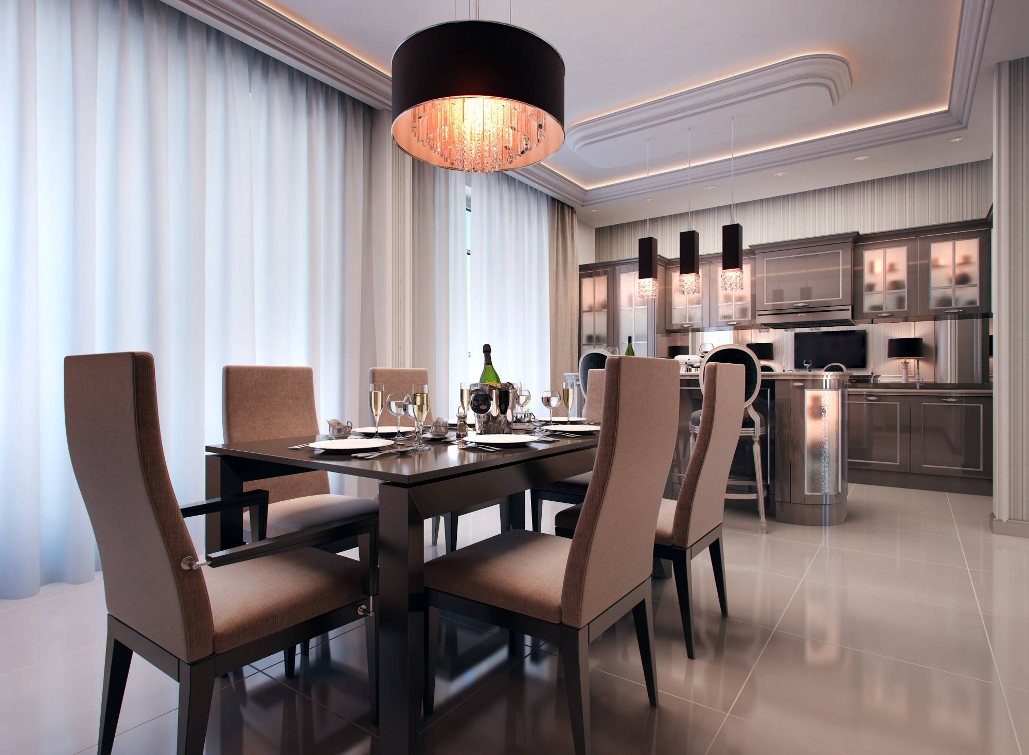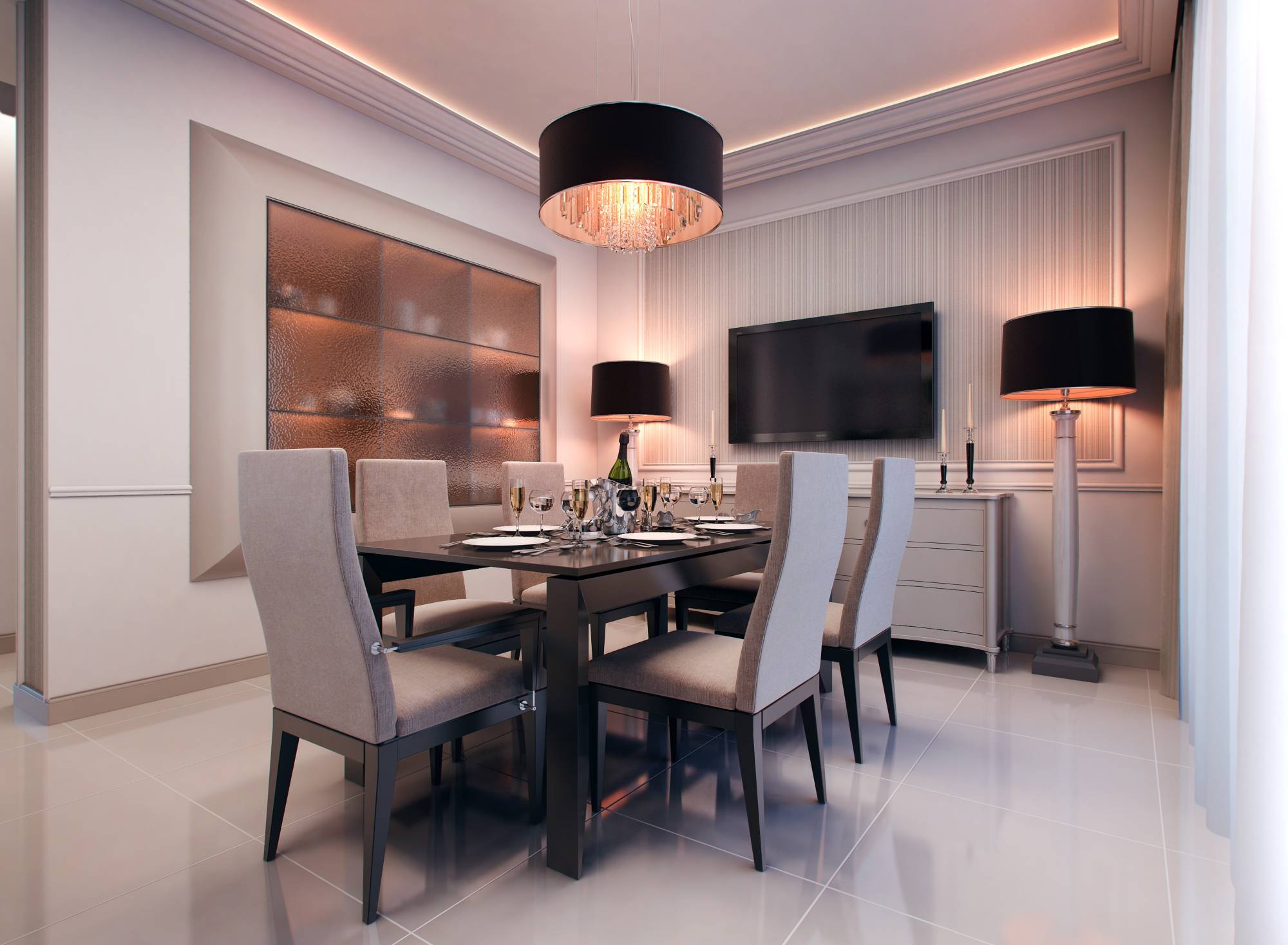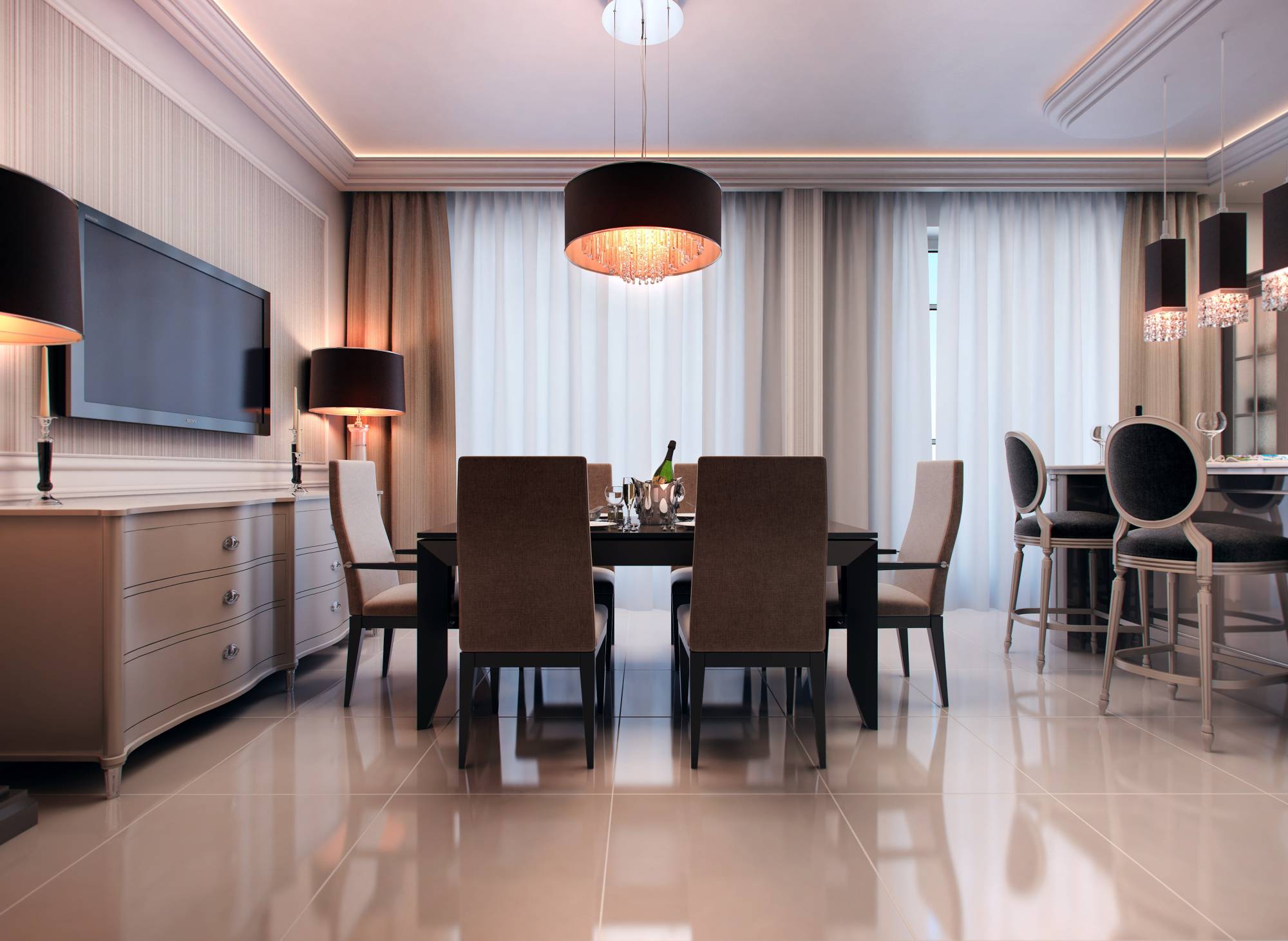 Обеденная зона оформлена в светлых тонах беж, доминанту задают глянцевый пол, гладкие оштукатуренные стены, комод и обивка стульев. В качестве точечных акцентов – обеденный стол венге и такие же темные абажуры люстры и торшеров.