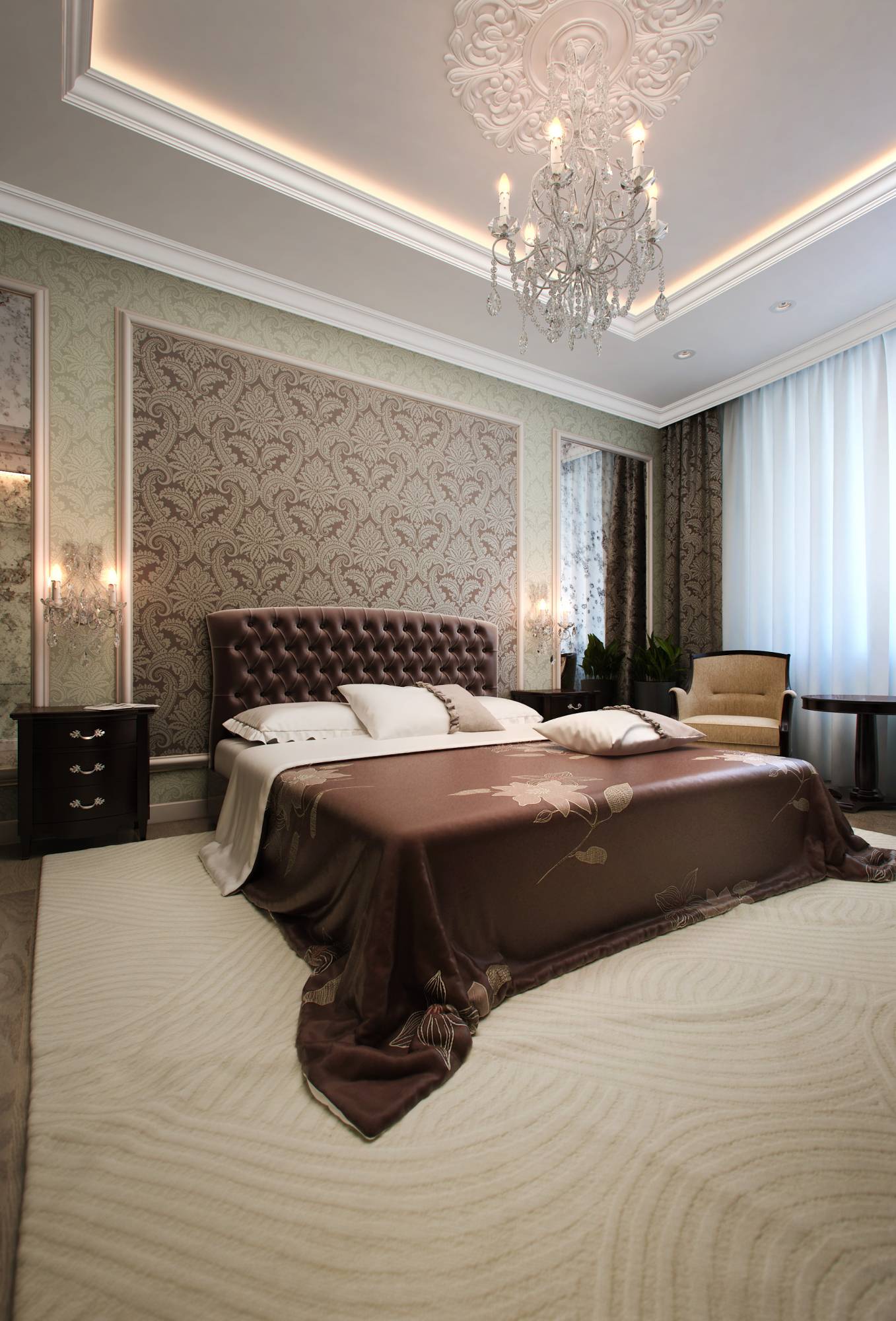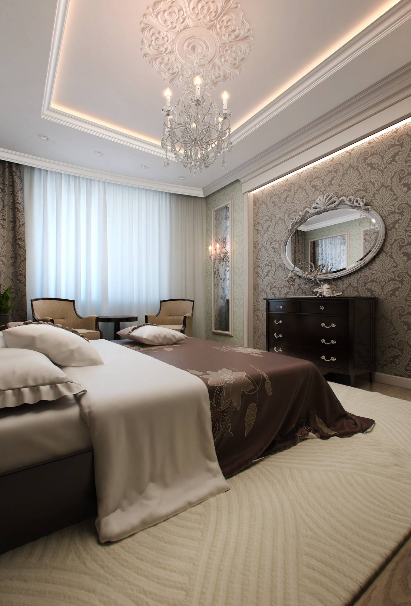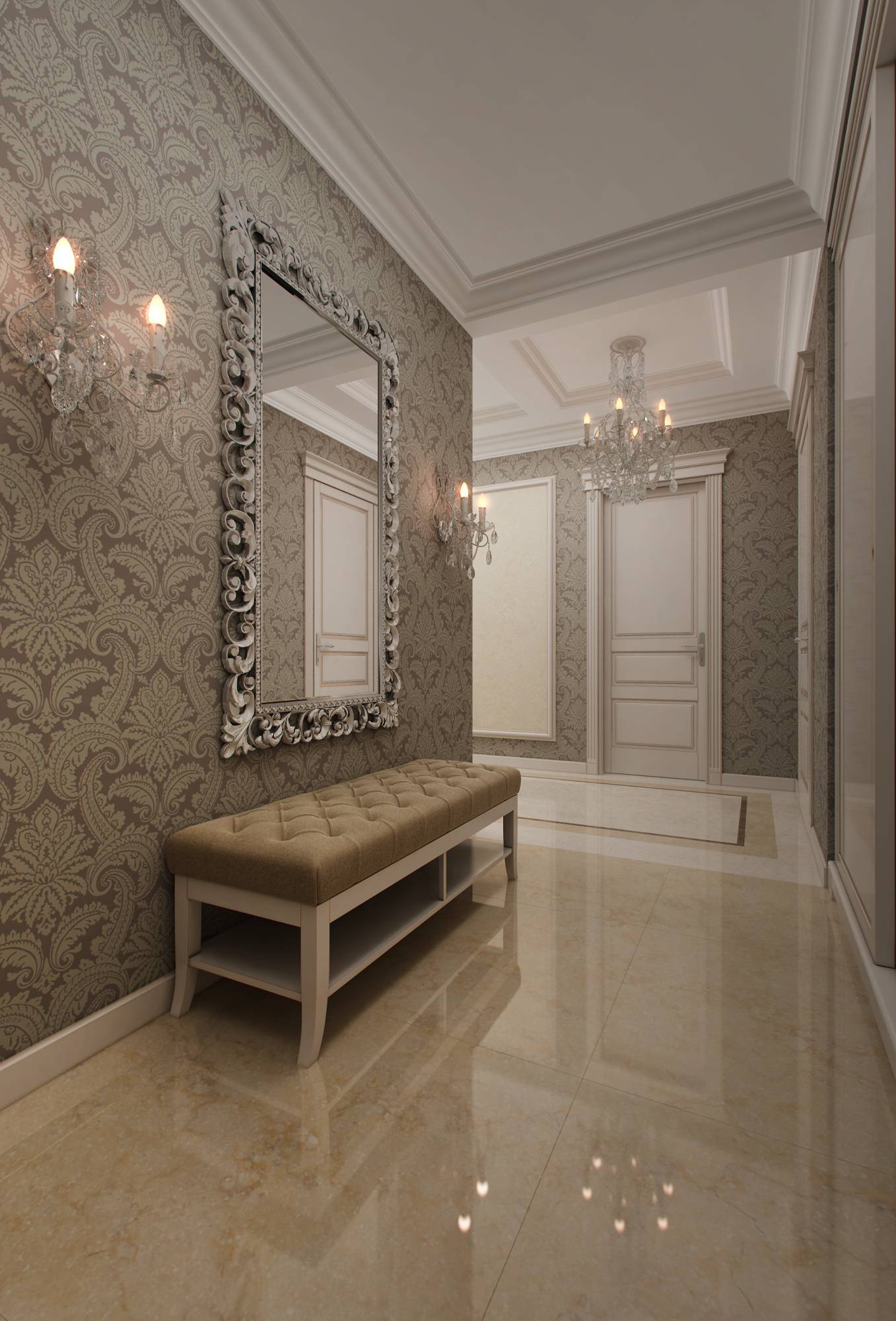 В отделке стен традиционно используются обои с классическим рисунком, в прихожей их орнамент поддержан витиеватым дизайном рамы зеркала. В спальне за счет комбинирования обоев более светлого и более темного бежевого тона выделены участки стен, обрамленные классическими молдингами – это помогает зонировать пространство.