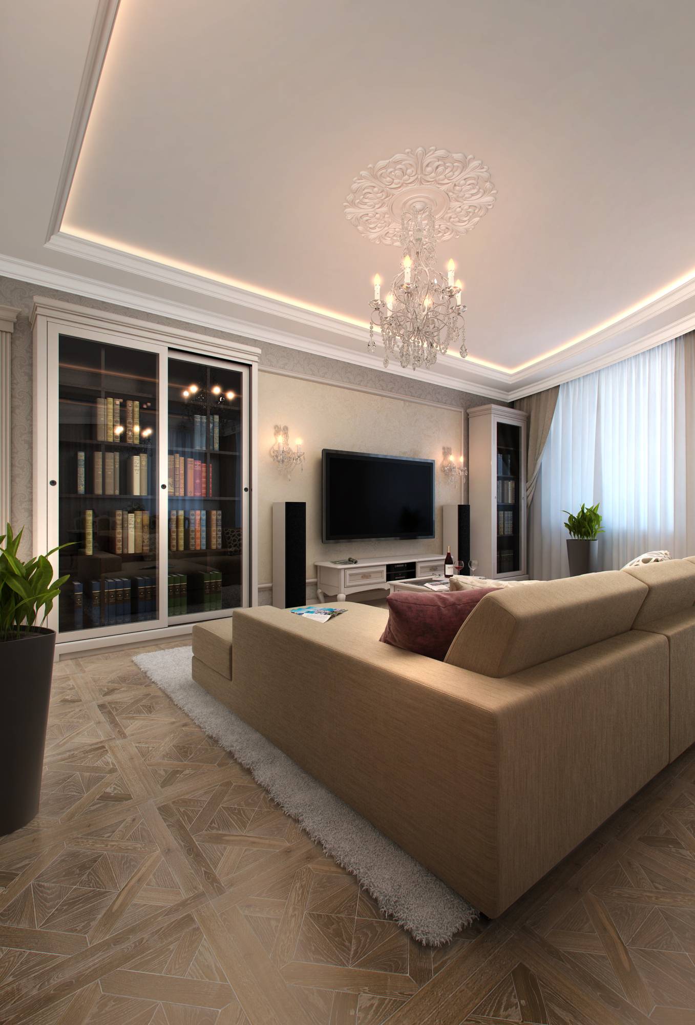 Классический стиль дизайн интерьера в современном прочтении для просторной квартиры выдержан в спокойных бежевых оттенках.