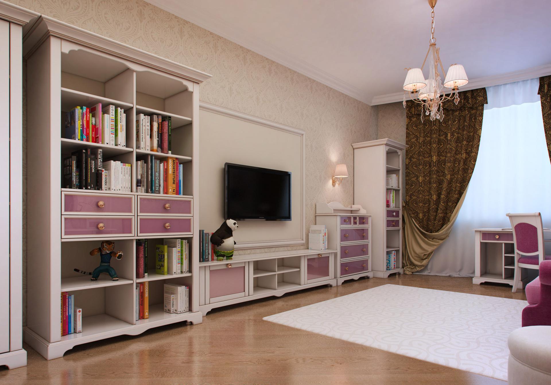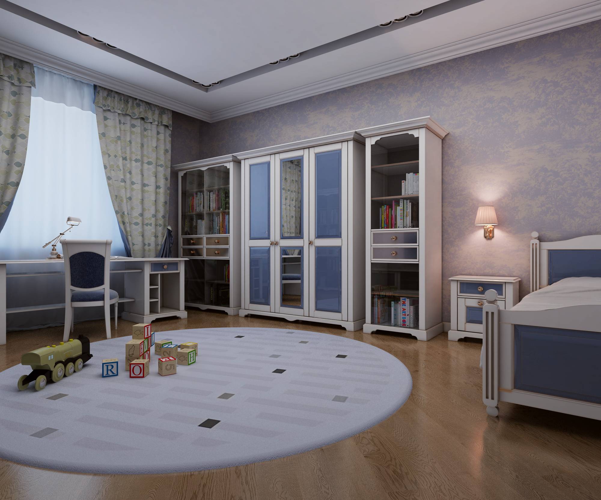 Интерьер комнаты для мальчика наполнен цветовыми акцентами синей гаммы, комната девочки расцвечена светлыми розовыми оттенками – их вносят мебельные фасады, обои. Дизайн второй детской – для девочки – полностью повторяет задумки дизайнера в комнате мальчика, кроме основного цвета. Он изменен на розовый, и вместе с ним кардинально меняется восприятие современного классического интерьера.
