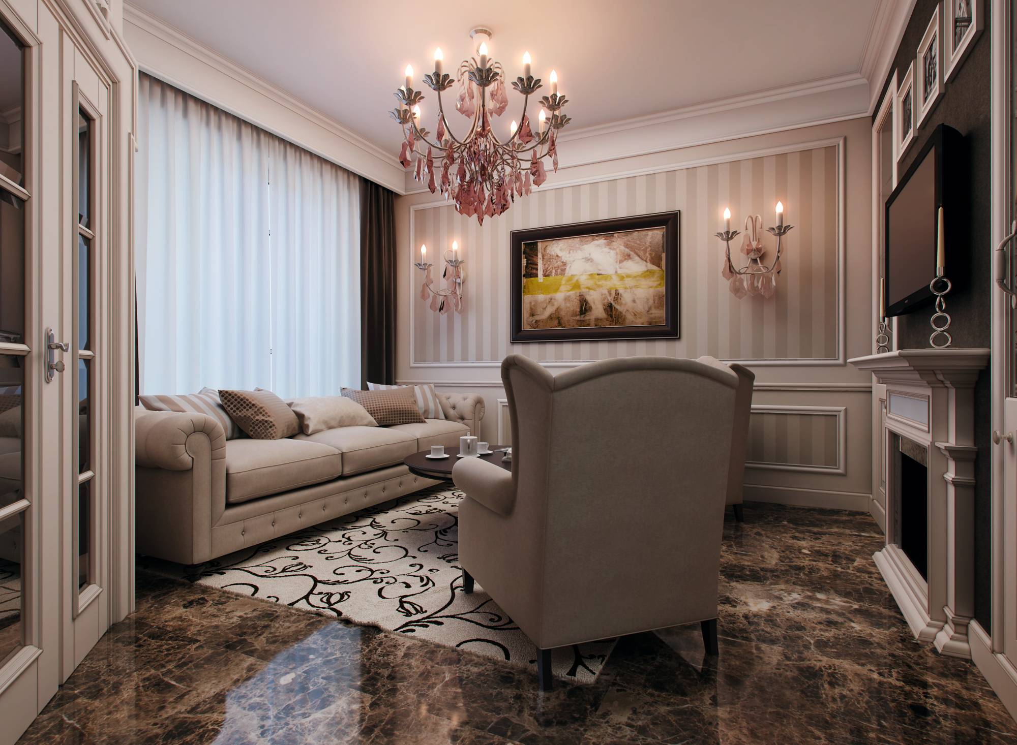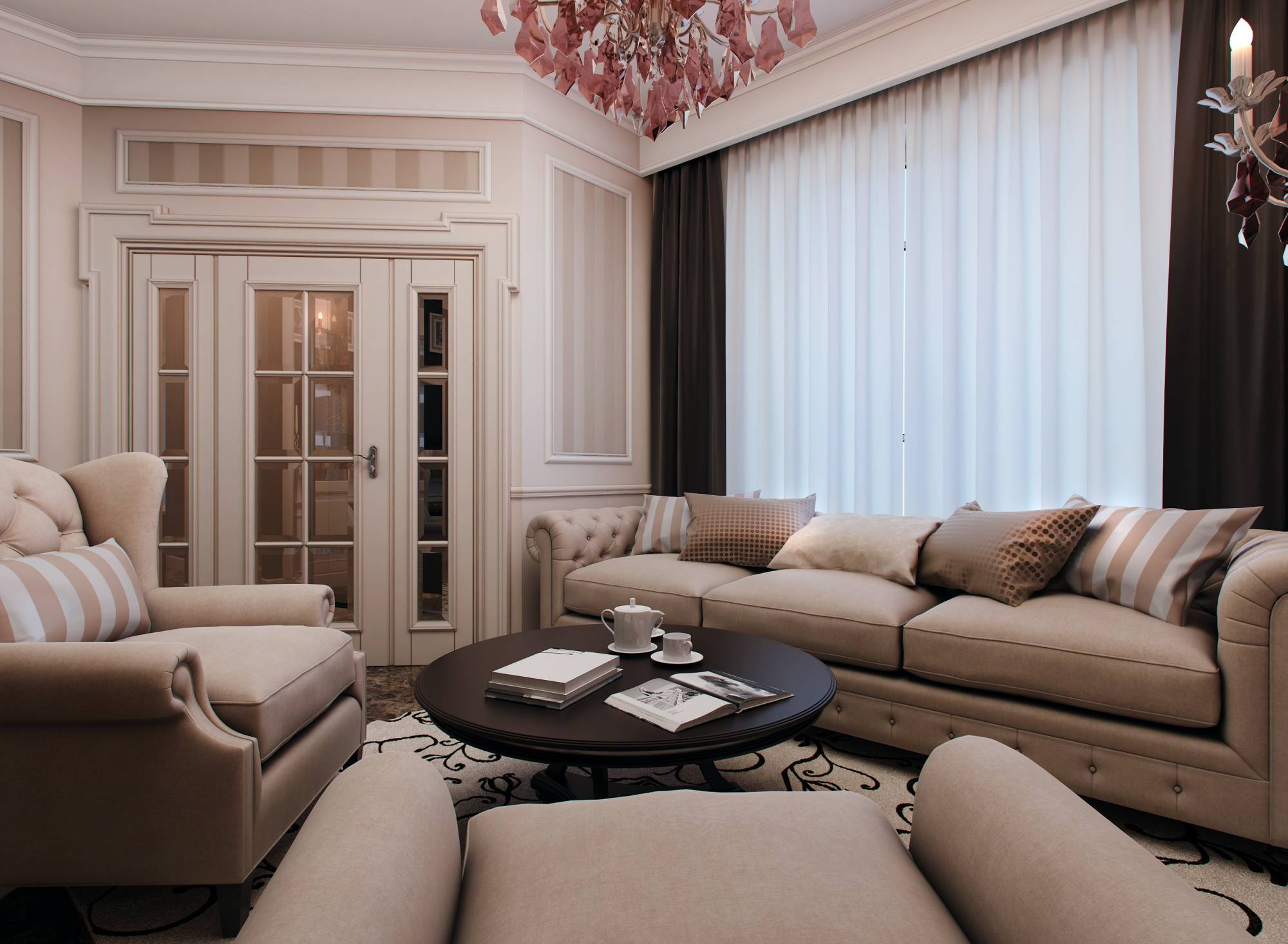 В отличие от остальных стен в интерьере гостиной, отделанных обоями светлых тонов в классическую полоску, одна стена окрашена в темно-коричневый цвет, что дополнительно акцентирует на ней внимание. Использованный в светлых обоях рисунок в полоску поддержан дизайном диванных подушек.