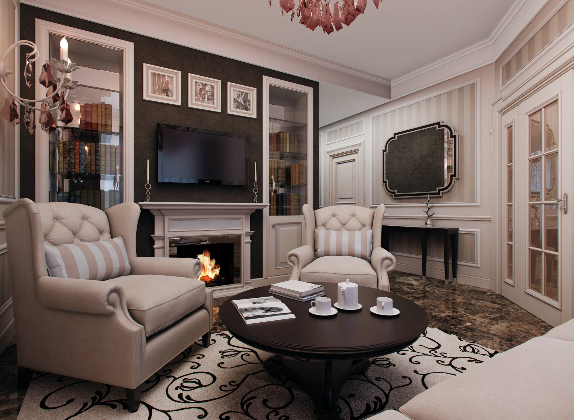 Диванную группу дополняют два удобных кресла вокруг кофейного столика. Противоположная стена занята книжными шкафами с прозрачными фасадами, камином в центре и ТВ-зоной над ним.