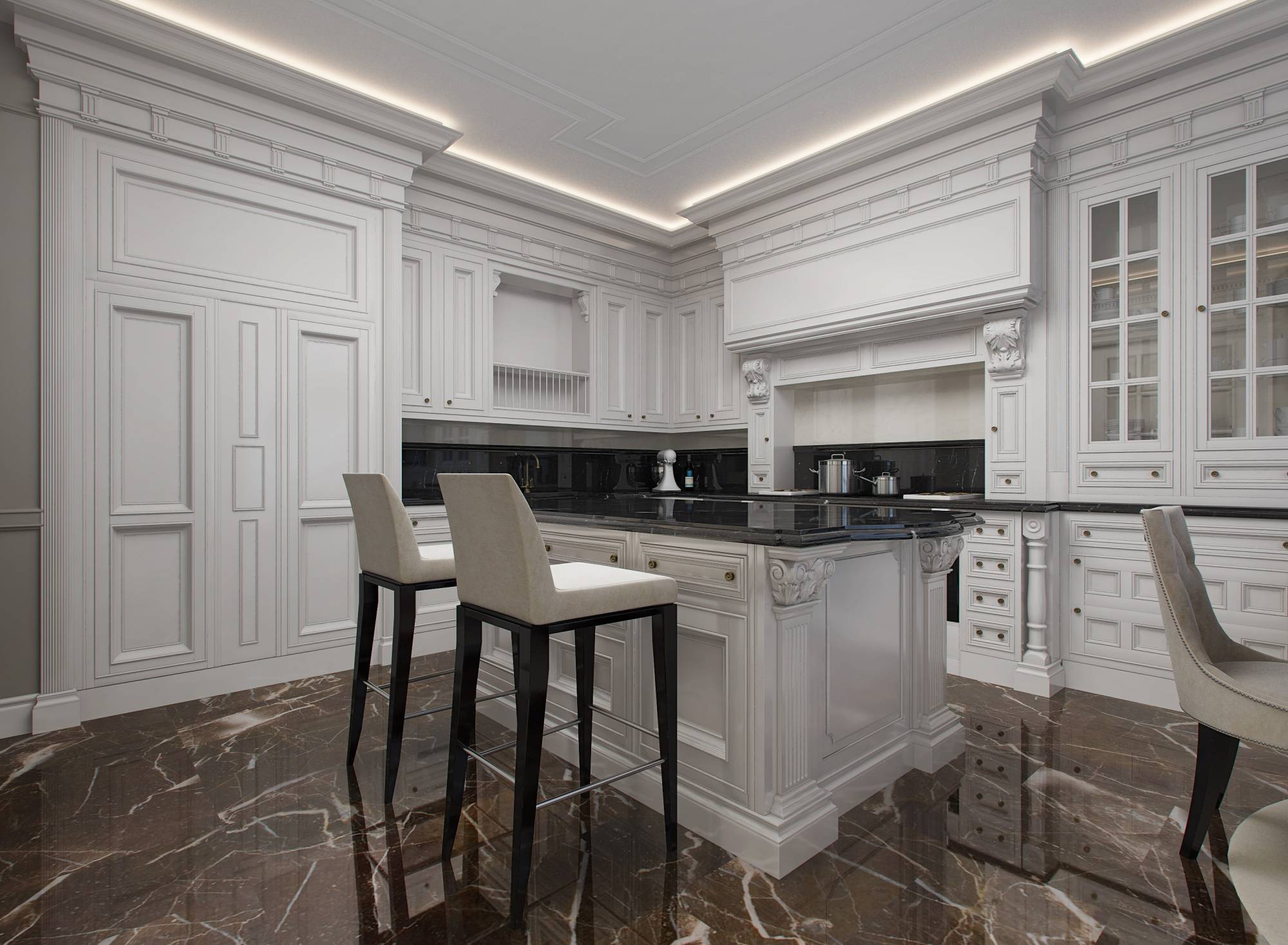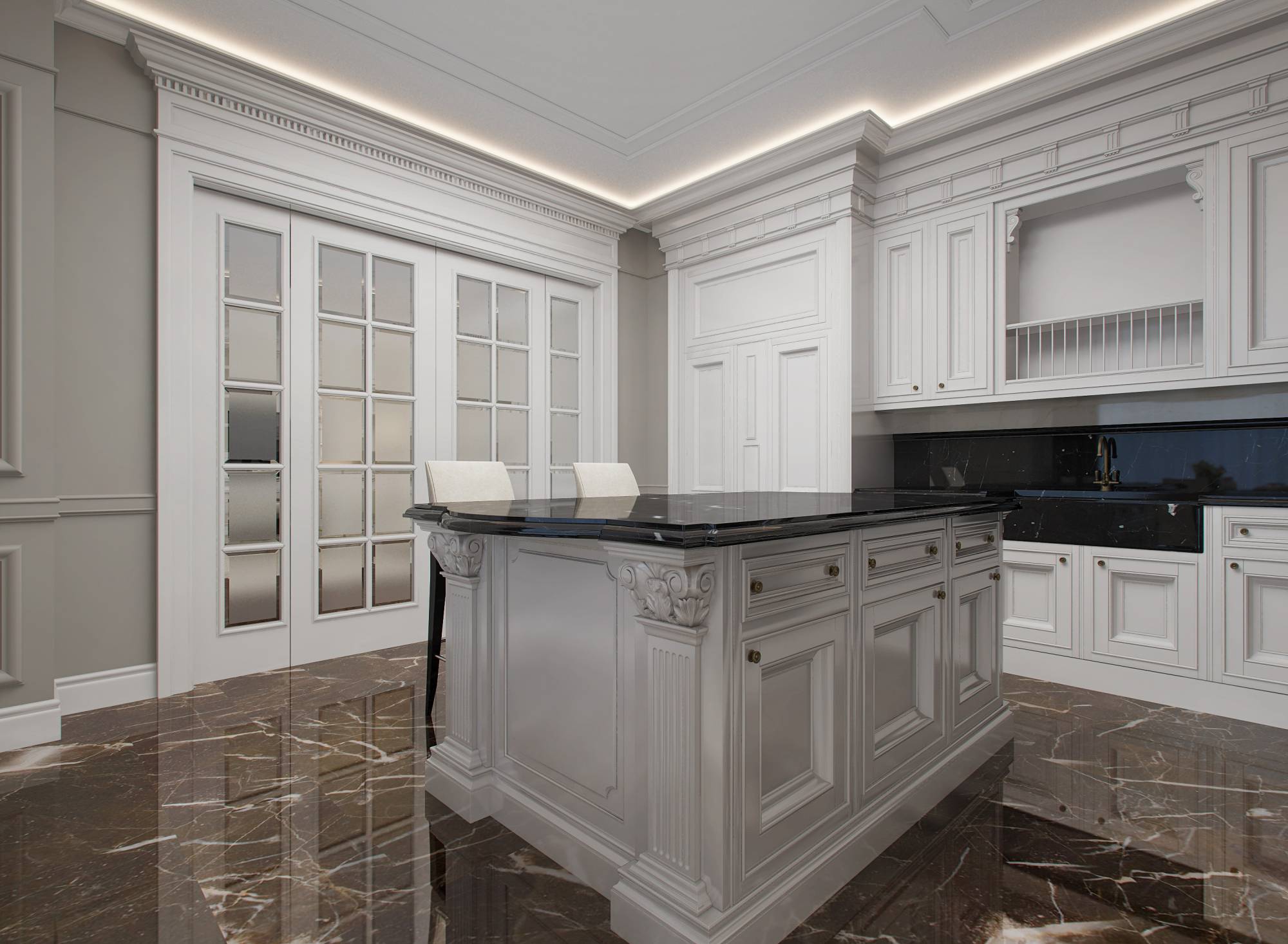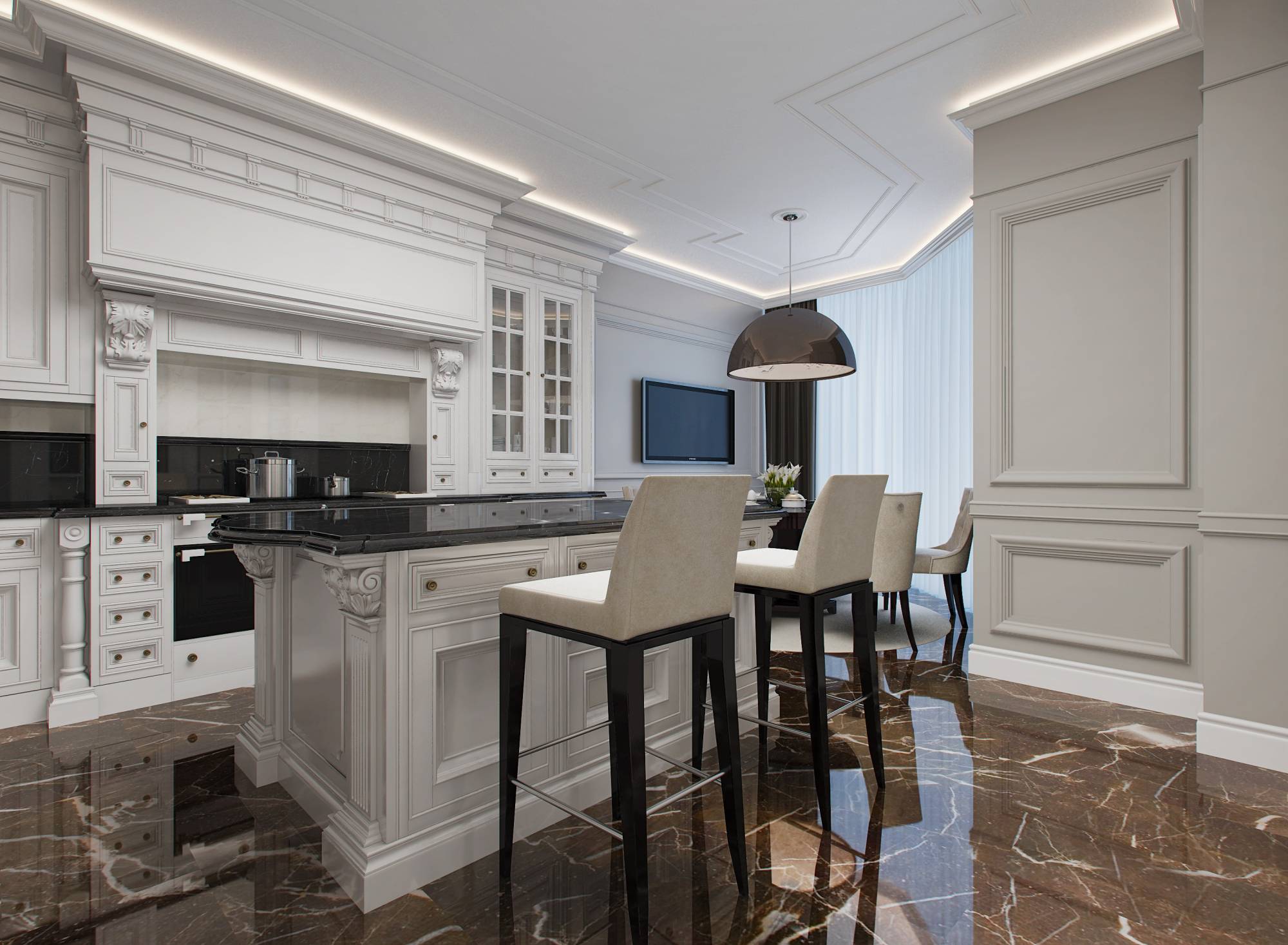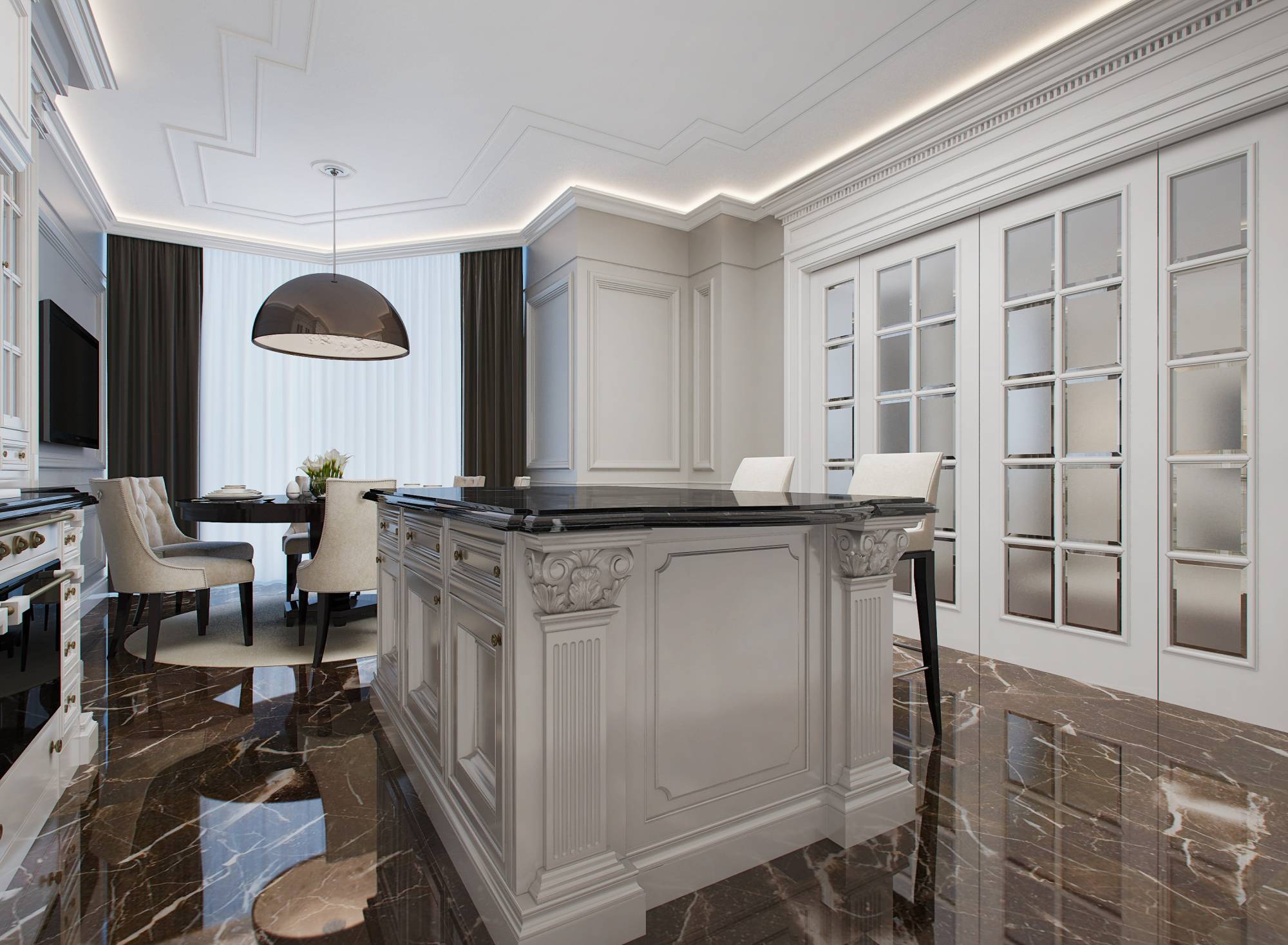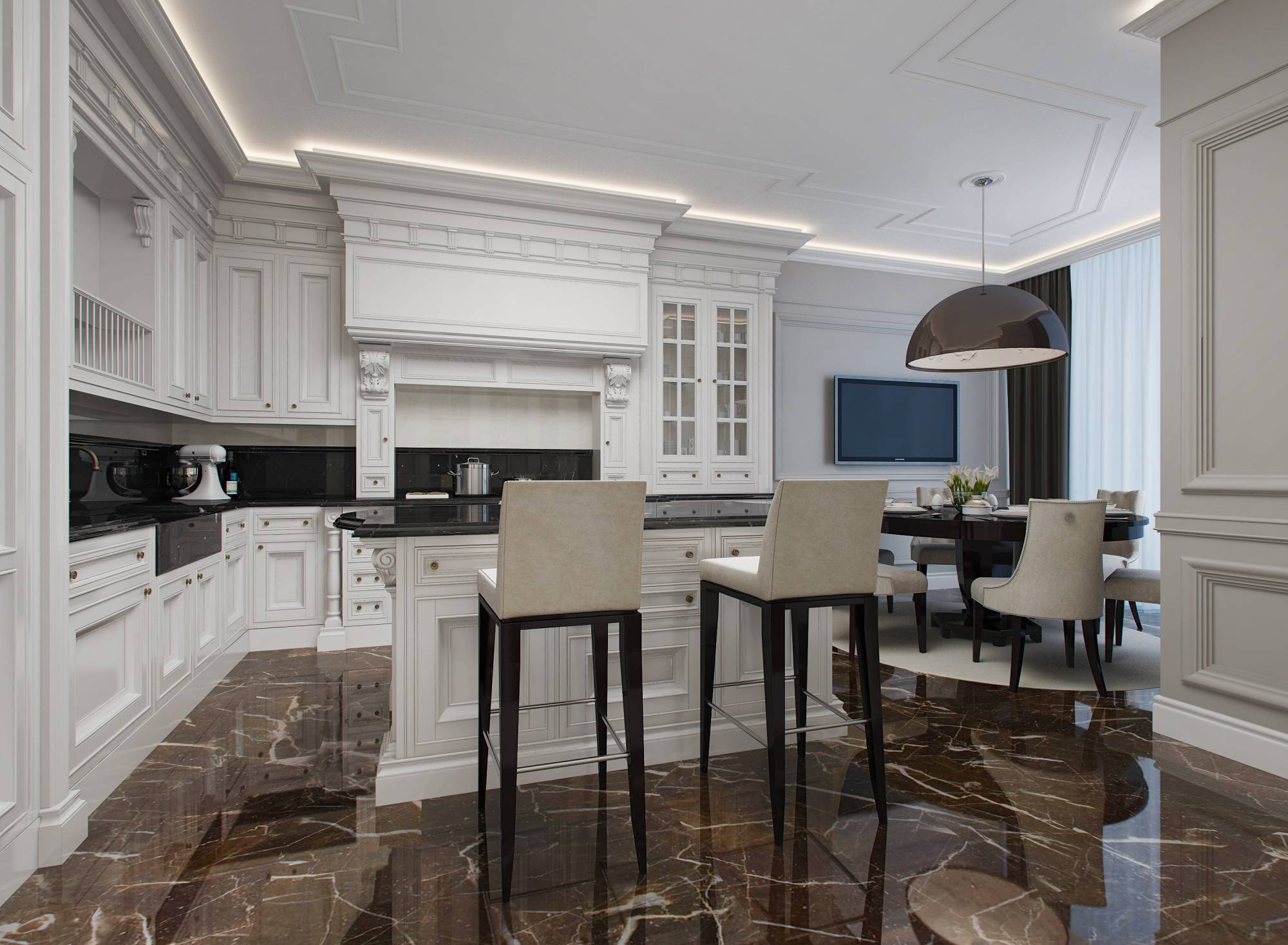 Белоснежные кухонные фасады с великолепным классическим декором, с его многоступенчатостью и обилием рельефов, очень органичны в сочетании с грифельно-черными столешницами и коричневой гаммой напольной плитки под мрамор. Установленный в центре кухни стол-остров выполняет роль рабочей поверхности, систем хранения и барной стойки. Особенность планировки – в боковом расположении столовой зоны, удаленной от гостиной.