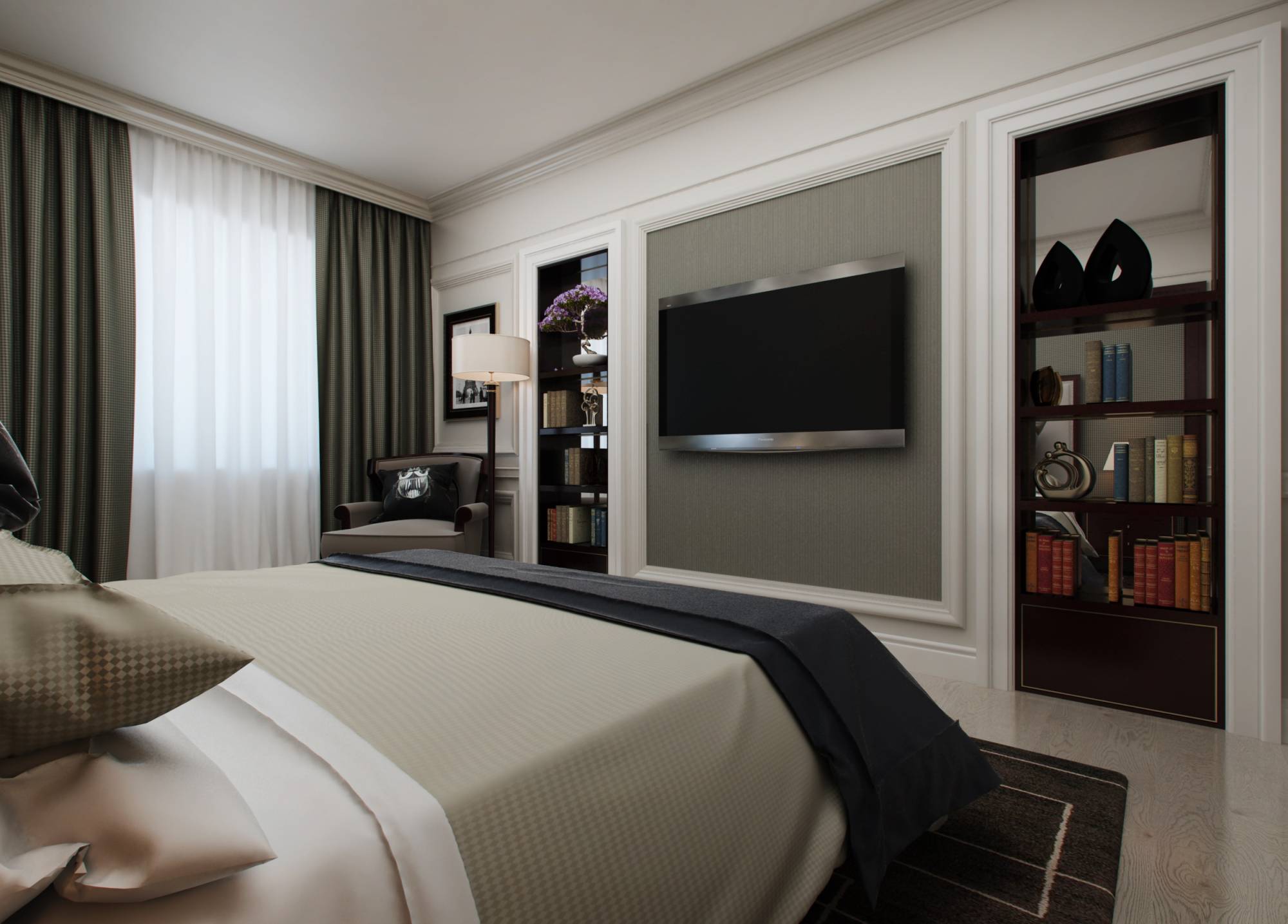 В дизайне спальни – предельное внимание к деталям. На окнах тяжелые портьеры изумрудного оттенка в мелкую английскую клетку, такой же тканью обтянута стена за изголовьем кровати и в зоне ТВ. Со светлыми стенами и потолком контрастируют темные коричневые цвета прикроватных тумб, стеллажей, паспарту с фотографиями.
