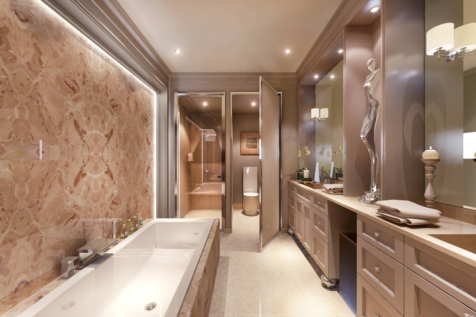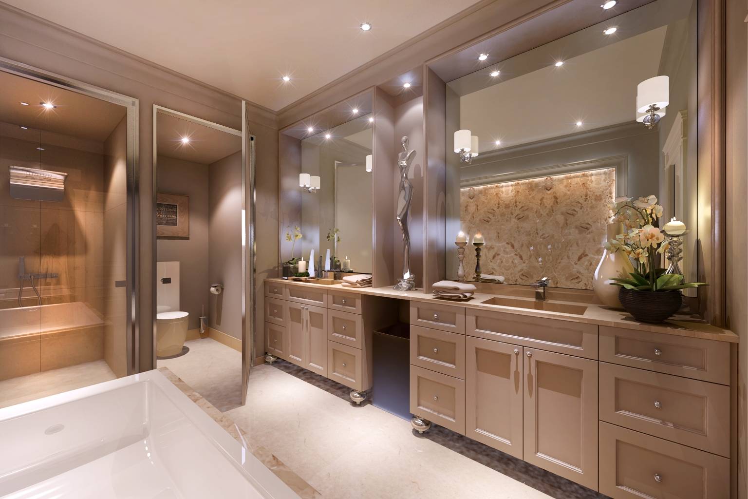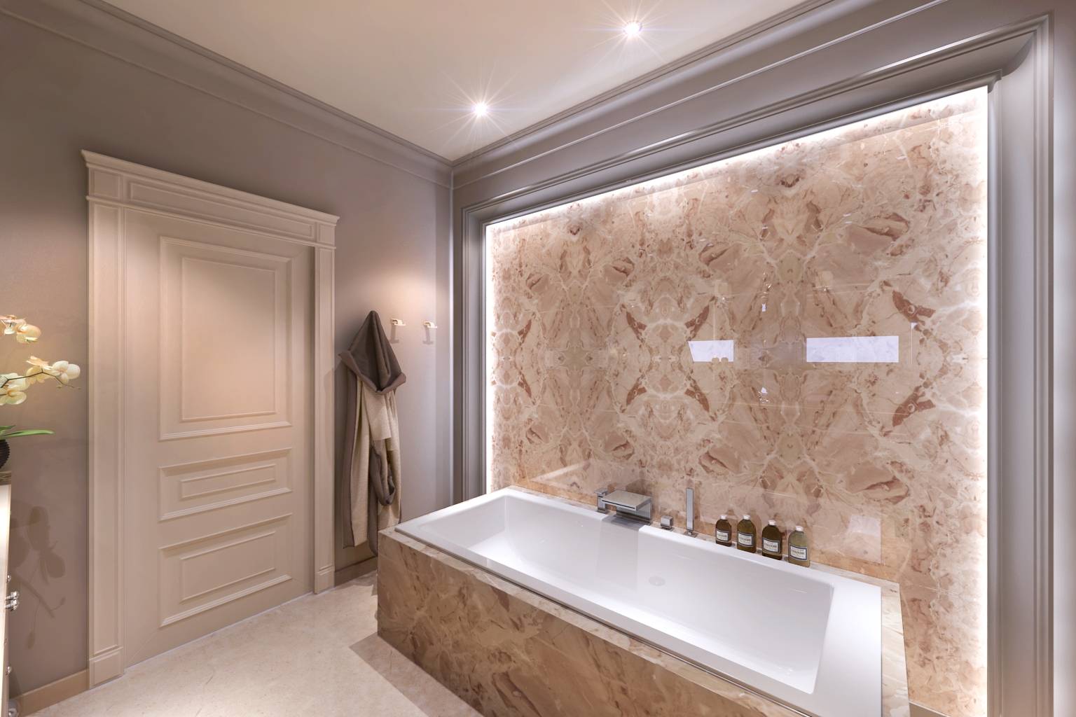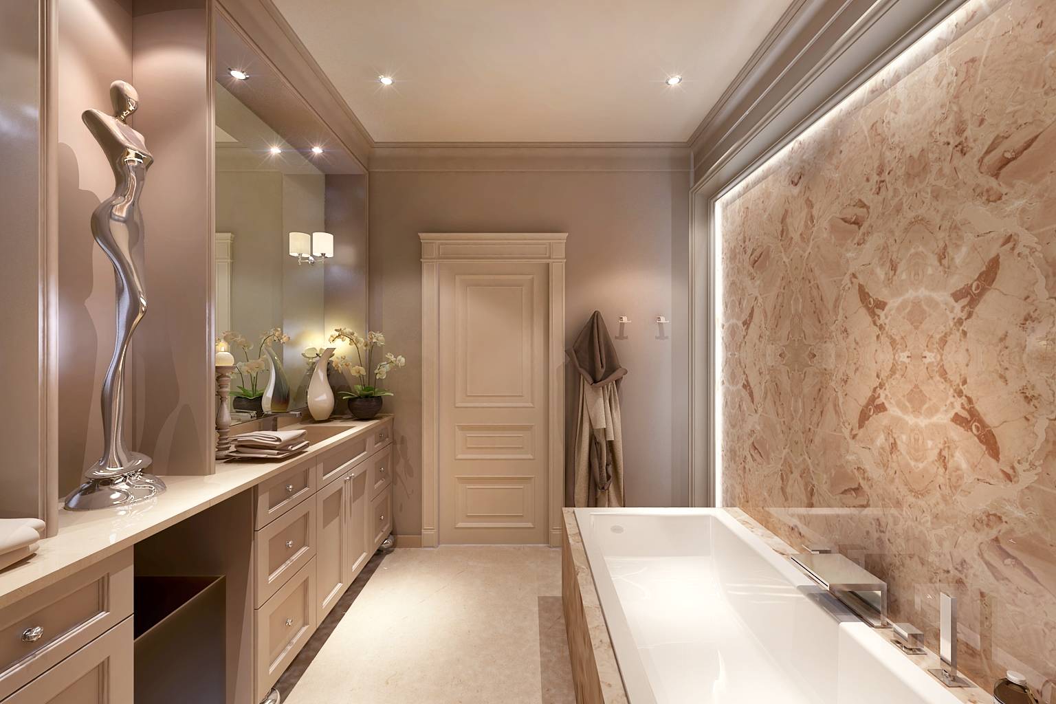 Отделка под мрамор в бежевых тонах делает интерьер ванной комнаты достойным продолжением классических традиций.