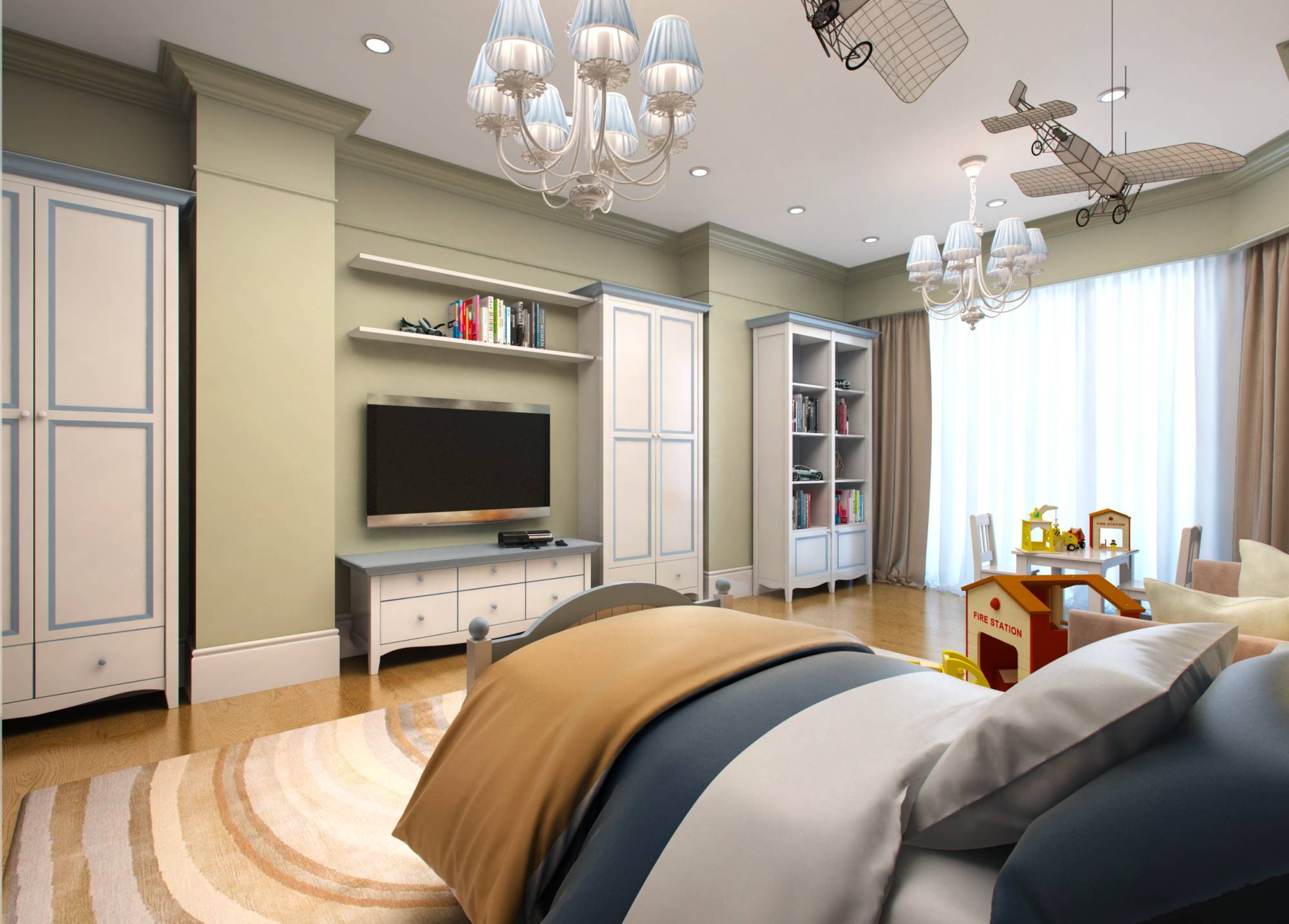 Для оформления детской подобраны спокойные оливковые оттенки в сочетании с белыми и серо-голубыми акцентами.