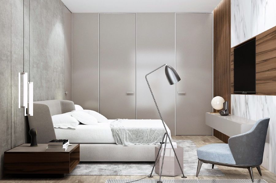 - После ремонта квартира в стиле минимализм получит угловую спальню с интерьером, выполненным в более насыщенных цветах. Основу задают деревянный пол шоколадного оттенка и такая же обшивка стены с телевизором. Компаньон – глубокий серый тон, в который окрашены подвесной потолок и объемная конструкция в ТВ-зоне. А чтобы комната не казалась сумрачной, подобрана яркая мебель (двуспальная кровать и тумбы, встроенный гардеробный шкаф, туалетный стол-полка).