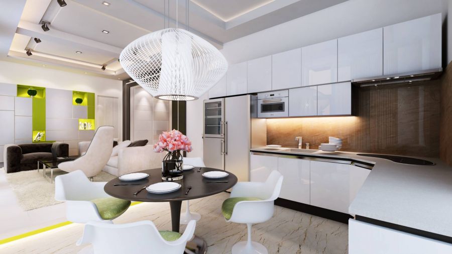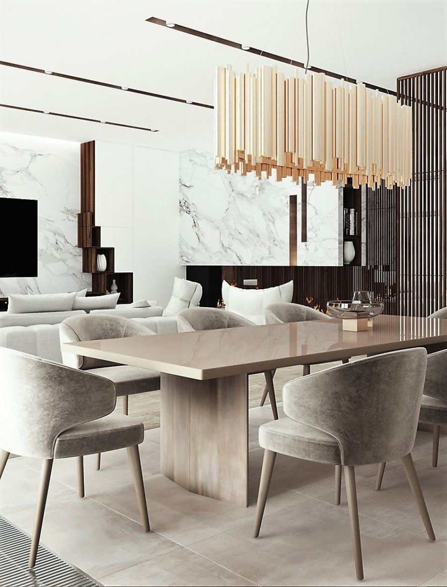 - Кухонный гарнитур имеет линейное расположение, что позволяет компактно установить оборудование, рабочую поверхность и системы хранения. Гладкие фасады шкафов красиво оттеняются молочно-серым мрамором столешницы и фартука-стены. Обеденный стол из тонированной древесины занимает выгодную позицию перед самым окном, так что всегда можно любоваться видом на городской пейзаж. Три подвесные лампы отвечают за локальное вечернее освещение.