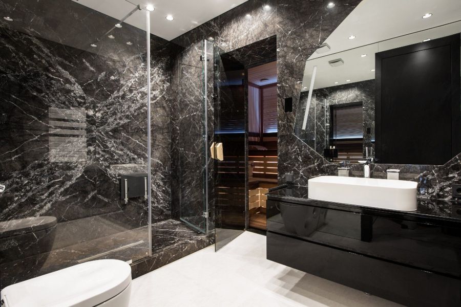 В проекте минималистичного дизайна квартиры после ремонта главную роль играет мраморная облицовка серых и белых оттенков. Эти стеновые материалы создают нейтральный светлый фон в объединенном пространстве гостиной-кухни, насыщают фактурой сдержанную обстановку ванной комнаты, гармонично сочетаются с текстильными и деревянными вставками в одной из спален.