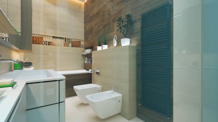 Оформление подчеркивает лаконичный характер интерьера. Чистый белый цвет – традиционный выбор для минималистичного ремонта: светлая за счет окон квартира кажется более солнечной и свободной. Идеальным компаньоном стала отделка темно-коричневым деревом зебрано. Это не слишком резкое для глаз сочетание, но вместе с тем достаточно контрастное, чтобы красиво выделить отдельные участки стен и корпусную мебель.