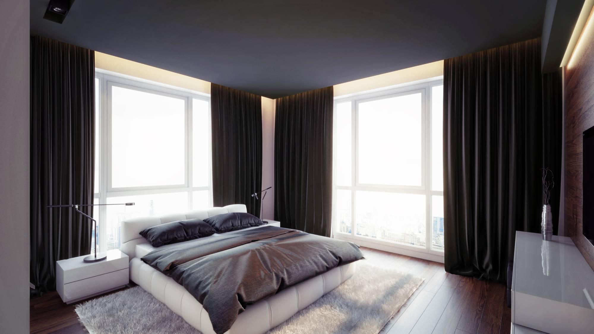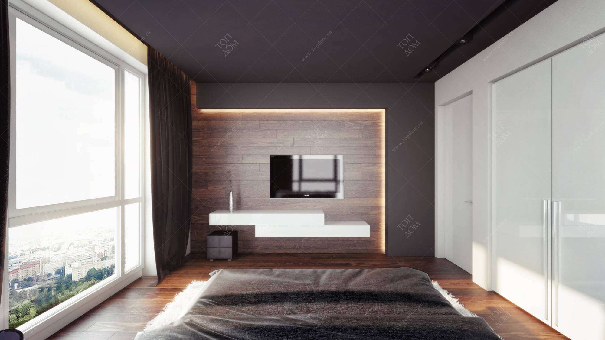 - После ремонта квартира в стиле минимализм получит угловую спальню с интерьером, выполненным в более насыщенных цветах. Основу задают деревянный пол шоколадного оттенка и такая же обшивка стены с телевизором. Компаньон – глубокий серый тон, в который окрашены подвесной потолок и объемная конструкция в ТВ-зоне. А чтобы комната не казалась сумрачной, подобрана яркая мебель (двуспальная кровать и тумбы, встроенный гардеробный шкаф, туалетный стол-полка).