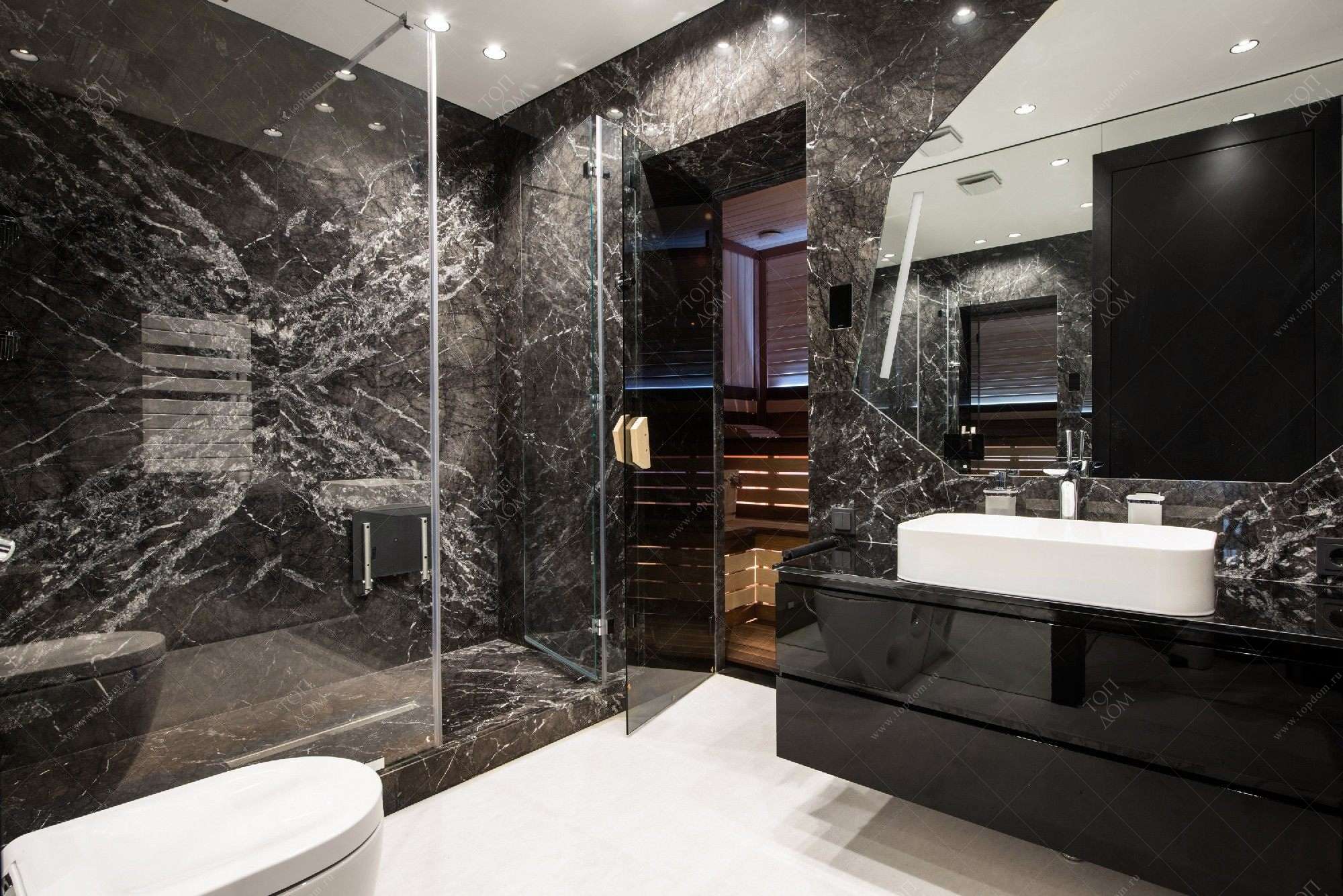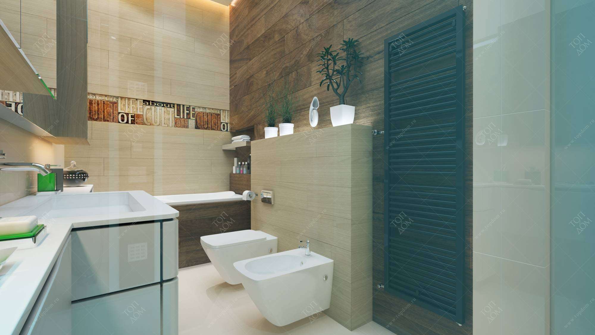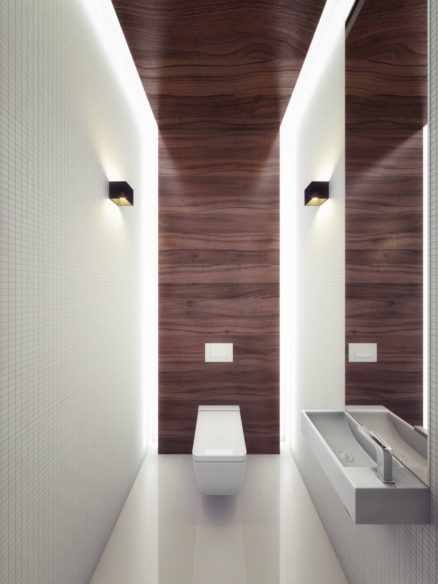 - Оформление санузла сочетает белоснежную мозаику, которая делает маленькое помещение зрительно больше, и покрытие зебрано в качестве декоративного элемента.
