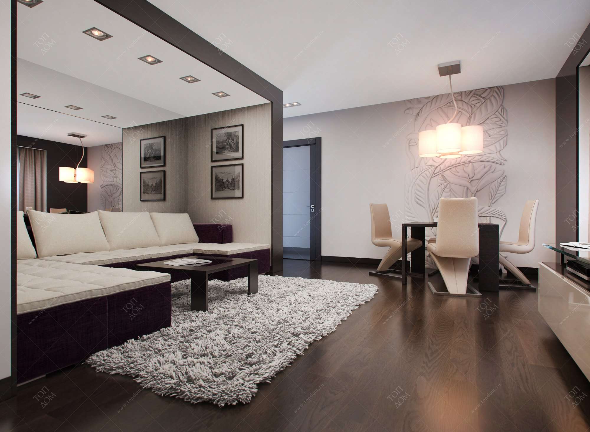 Как видно из примеров, для ремонта квартиры в стиле минимализм характерны объединенная планировка гостиной, монохромная или контрастная цветовая палитра, мебель простых форм и совсем немного декора. Ощущение уюта достигается за счет фактур дерева, текстиля, грамотной подсветки. Воплотить равновесие между сдержанностью и комфортом вам помогут индивидуальные дизайн-проекты «ТопДом».
