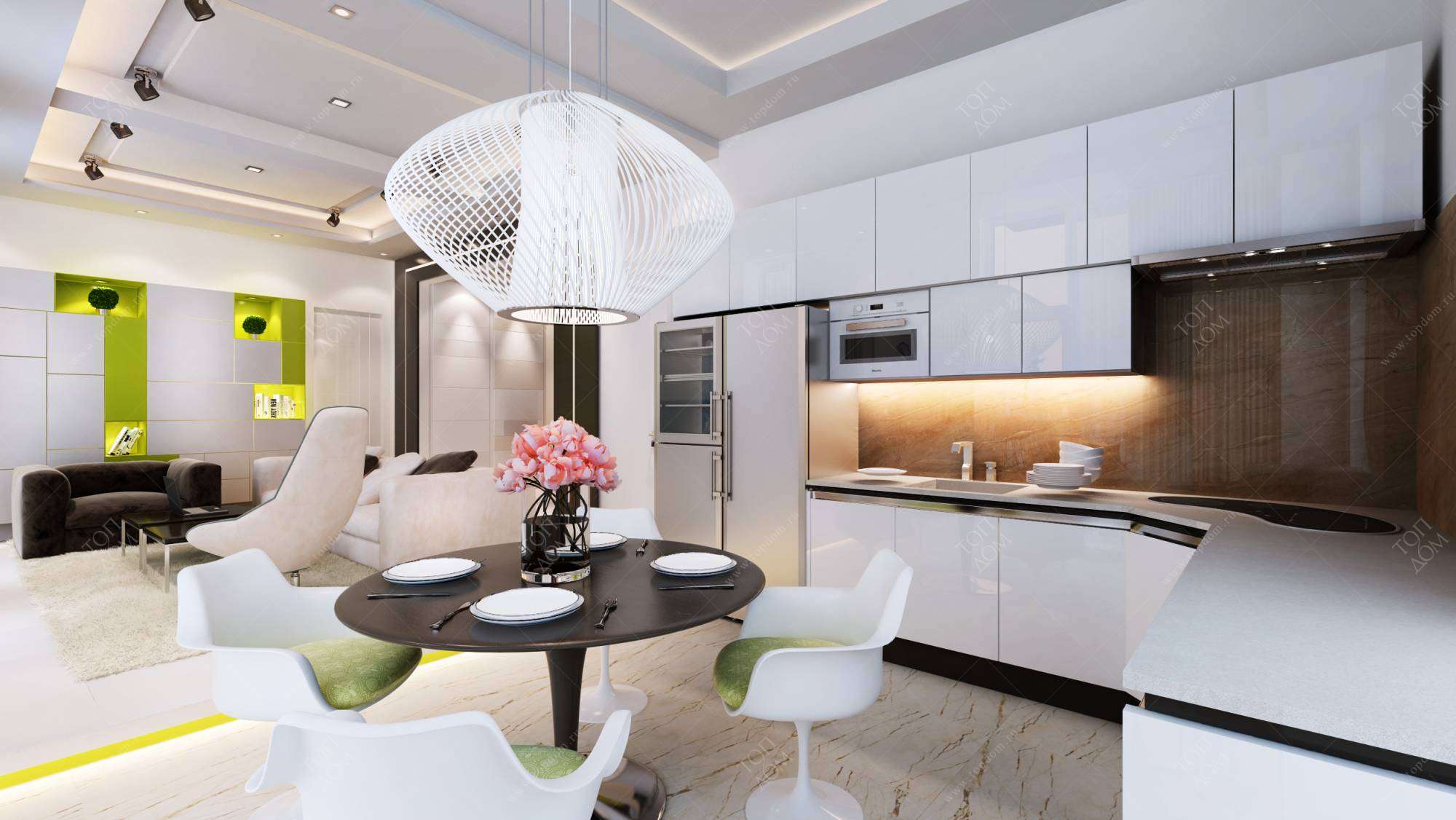 Пример современного интерьера в белой гамме с совмещенной планировкой кухни-гостиной и панорамным остеклением. Черные элементы акцентируют зонирование (обрамление прохода из прихожей, журнальная консоль, обеденный стол). Свежим и ярким обстановку делают точечные включения зеленого цвета (окрашенные ниши стеллажа, невысокий подиум на границе кухни и гостиной). Оформление ванной комнаты в духе эко-минимализма наполнено деревянными фактурами и теплыми коричневыми оттенками.