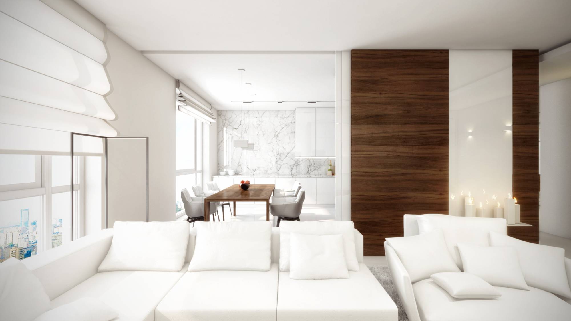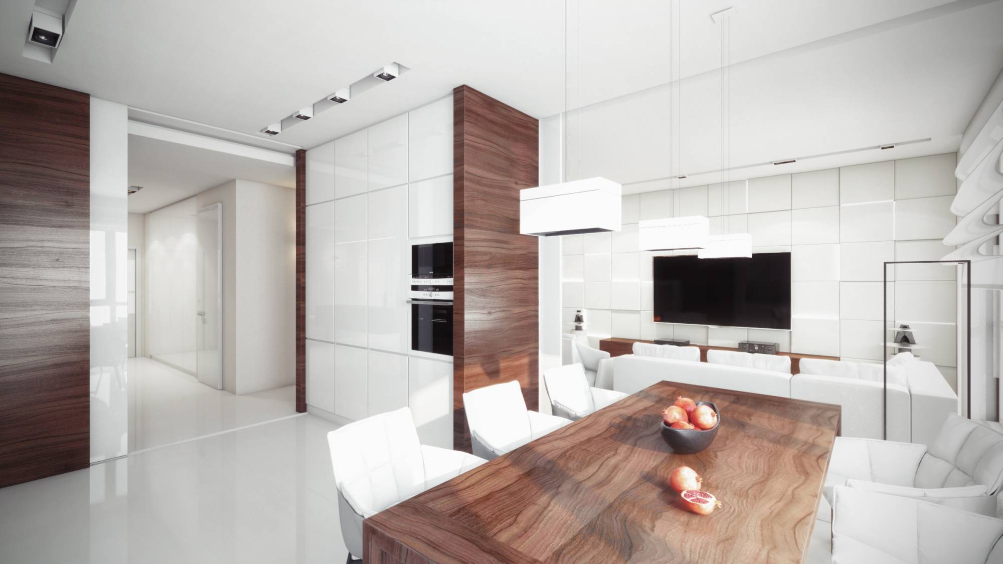 Оформление подчеркивает лаконичный характер интерьера. Чистый белый цвет – традиционный выбор для минималистичного ремонта: светлая за счет окон квартира кажется более солнечной и свободной. Идеальным компаньоном стала отделка темно-коричневым деревом зебрано. Это не слишком резкое для глаз сочетание, но вместе с тем достаточно контрастное, чтобы красиво выделить отдельные участки стен и корпусную мебель.