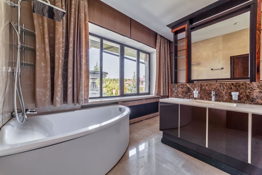 7. А вот как будет выглядеть большая, наполненная светом ванная, если применить нежно-коричневый акцентно – в виде штор (проект красивого ремонта частного дома).