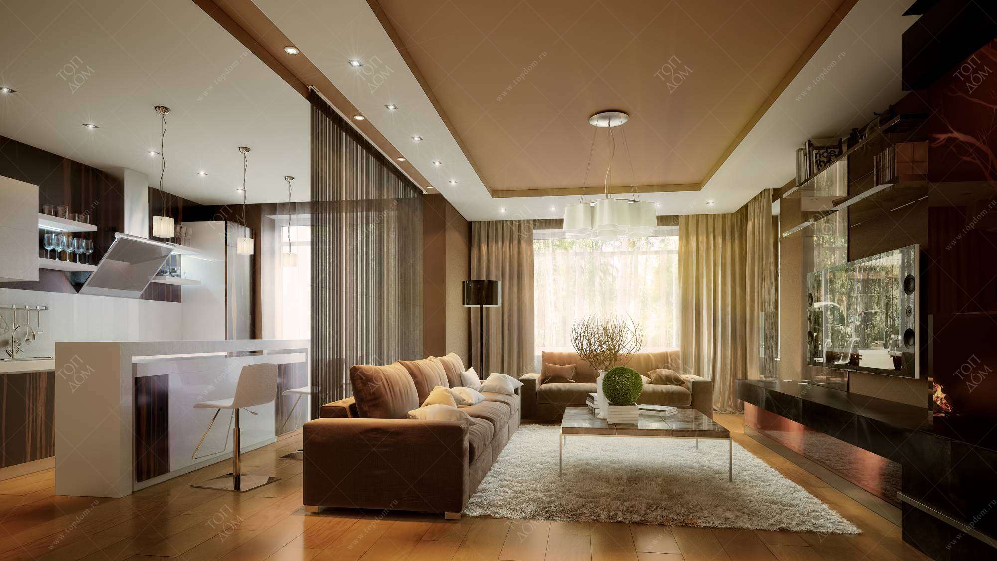 Проект дизайна общественной части квартиры в коричневых тонах создает спокойное и комфортное, колористически уравновешенное пространство, где мягкий контраст темных и светлых элементов реализуется в отделке основных поверхностей и мебели.