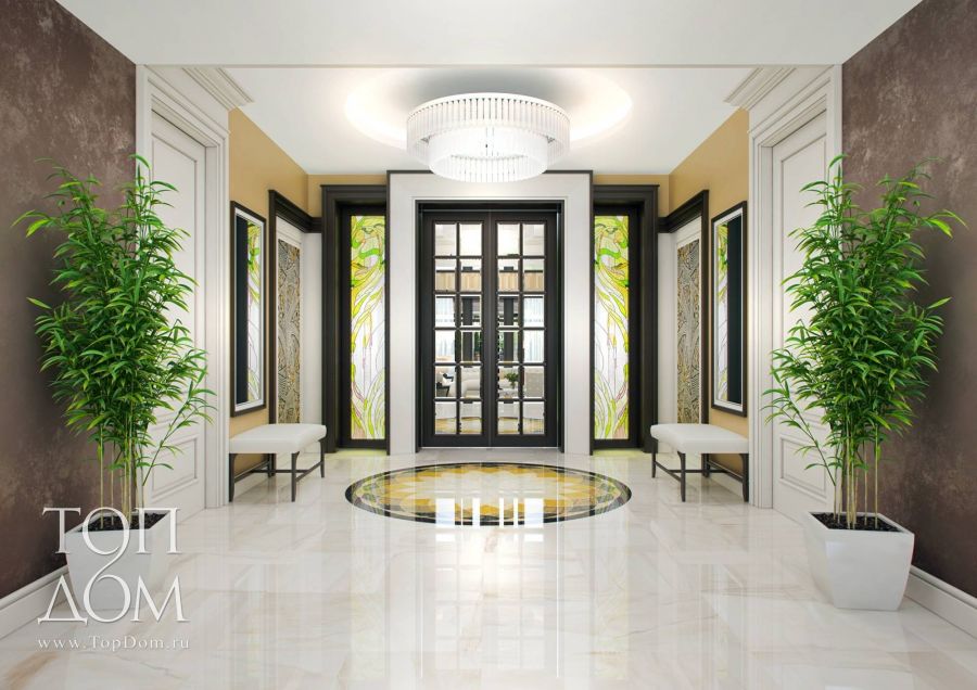 Наглядный пример, какие цвета сочетаются с мокко в интерьере, – отделочные решения большого холла в проекте дизайнерского оформления дома. Яркая песочная краска на стенах входной зоны переходит в сложный насыщенный серо-коричневый тон на выходе в гостиную. Желто-зеленые витражи и напольное панно – энергичный акцент на фоне белоснежного мраморной плитки и контрастного, почти черного дерева.