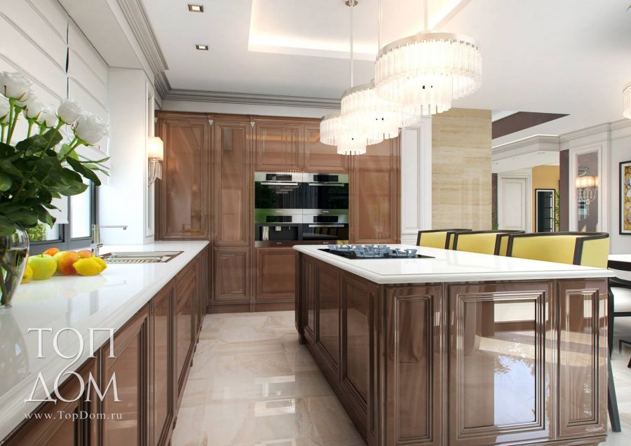 Пример, как нарядно и свежо выглядят глянцевые кухонные фасады в мягкой шоколадной гамме с белыми столешницами (проект дизайнерских интерьеров дома в подмосковном поселке Соверен):