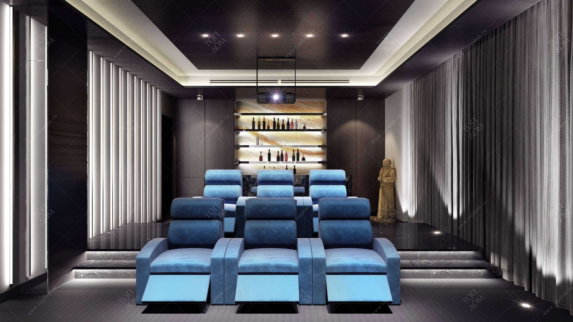 3. В отделке домашнего кинотеатра (концепт изысканного оформления дома в Ялте) темно-коричневые стеновые панели из натурального дерева гармонируют с ярко-синими креслами и барной стойкой из черного гранита.