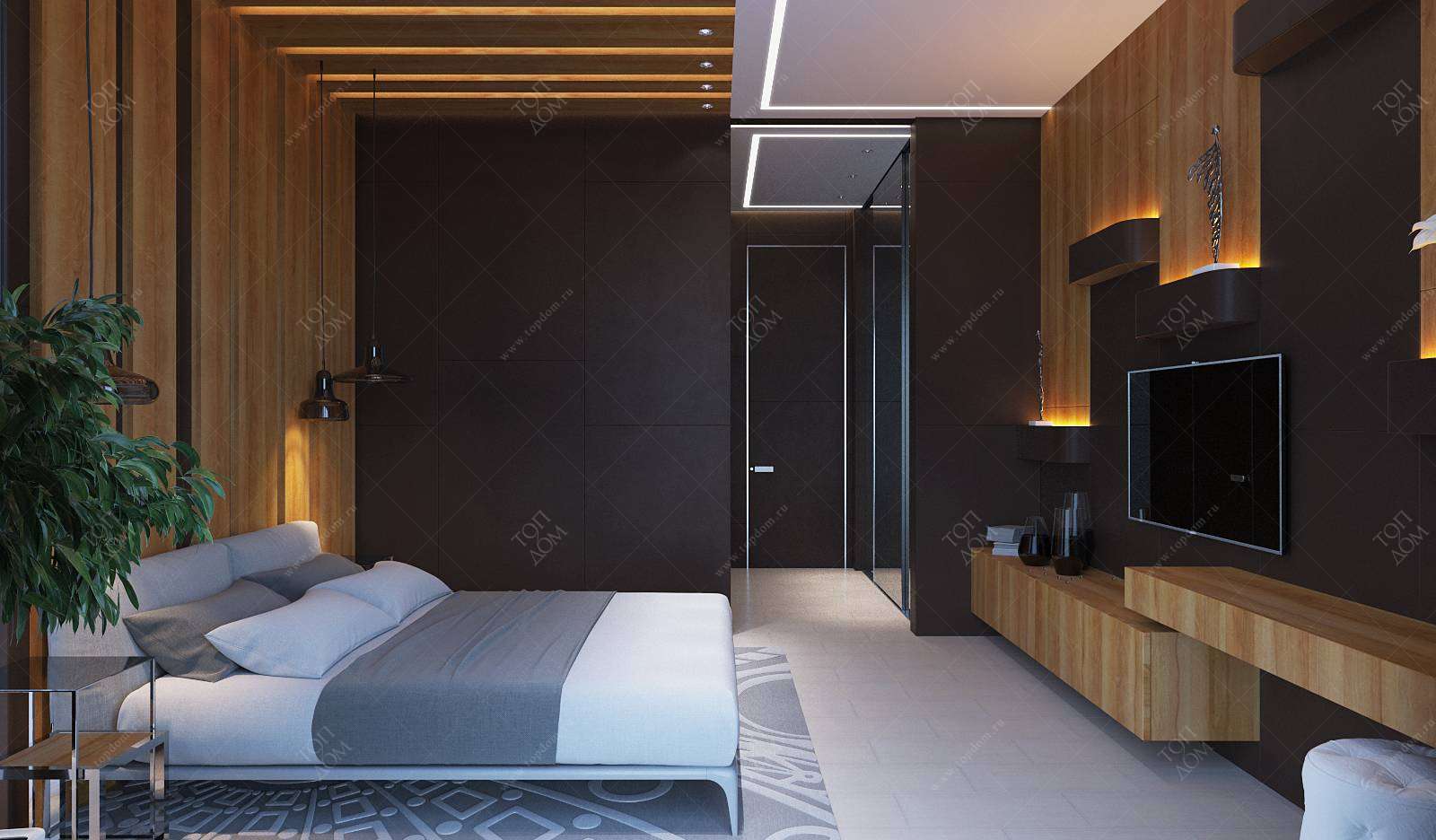 9. Уютную атмосферу в еще одной спальне – только более компактной – создают коричнево-ореховые стены в комбинации со светло-серым полом и потолком (больше фото здесь).