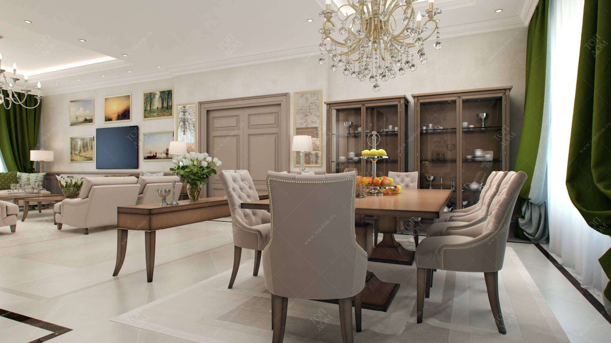 Двери цвета мокко в интерьере обычно стилистически связаны с корпусной мебелью. Например, как в гостиной-столовой из проекта комфортного дизайна дома в коттеджном поселке Вашутино.