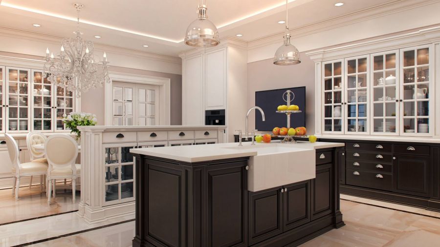 1. В оформлении большой кухни из проекта комфортных интерьеров загородного дома мебель и столешницы оттенка слоновой кости создают благородный светлый фон для филенчатых фасадов концентрированного коричневого тона.