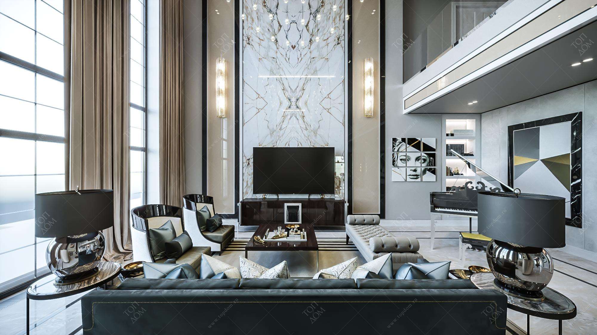 Богатое сочетание цвета мокко в интерьере загородного дома можно увидеть в проекте элегантного дизайна. В оформлении двусветной гостиной использованы сразу две его полярные тональности – светлый какао в отделке стены, межэтажного перекрытия и портьерах, темно-кофейный в глянцевой мебели. Основу цветового решения комнаты составляют серые краски от густого маренго до бледного беж, с включением белого, черного, серебристого.