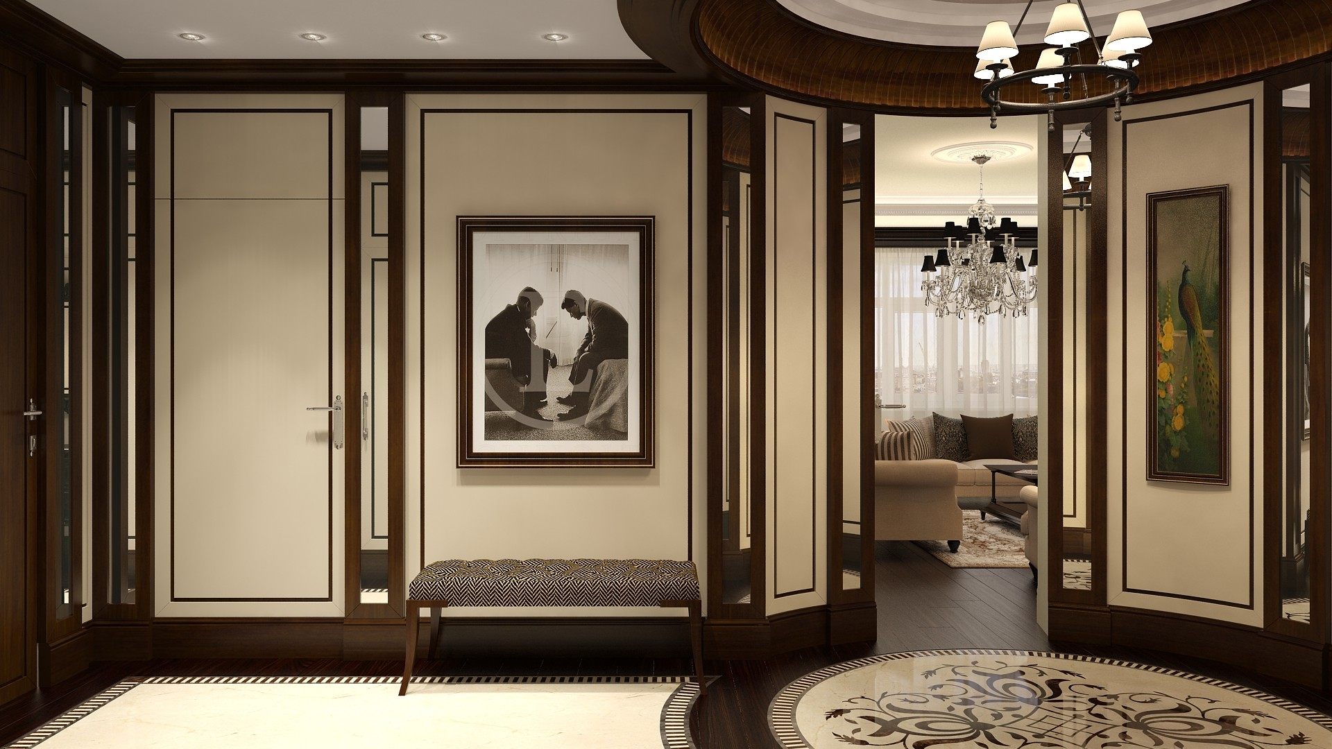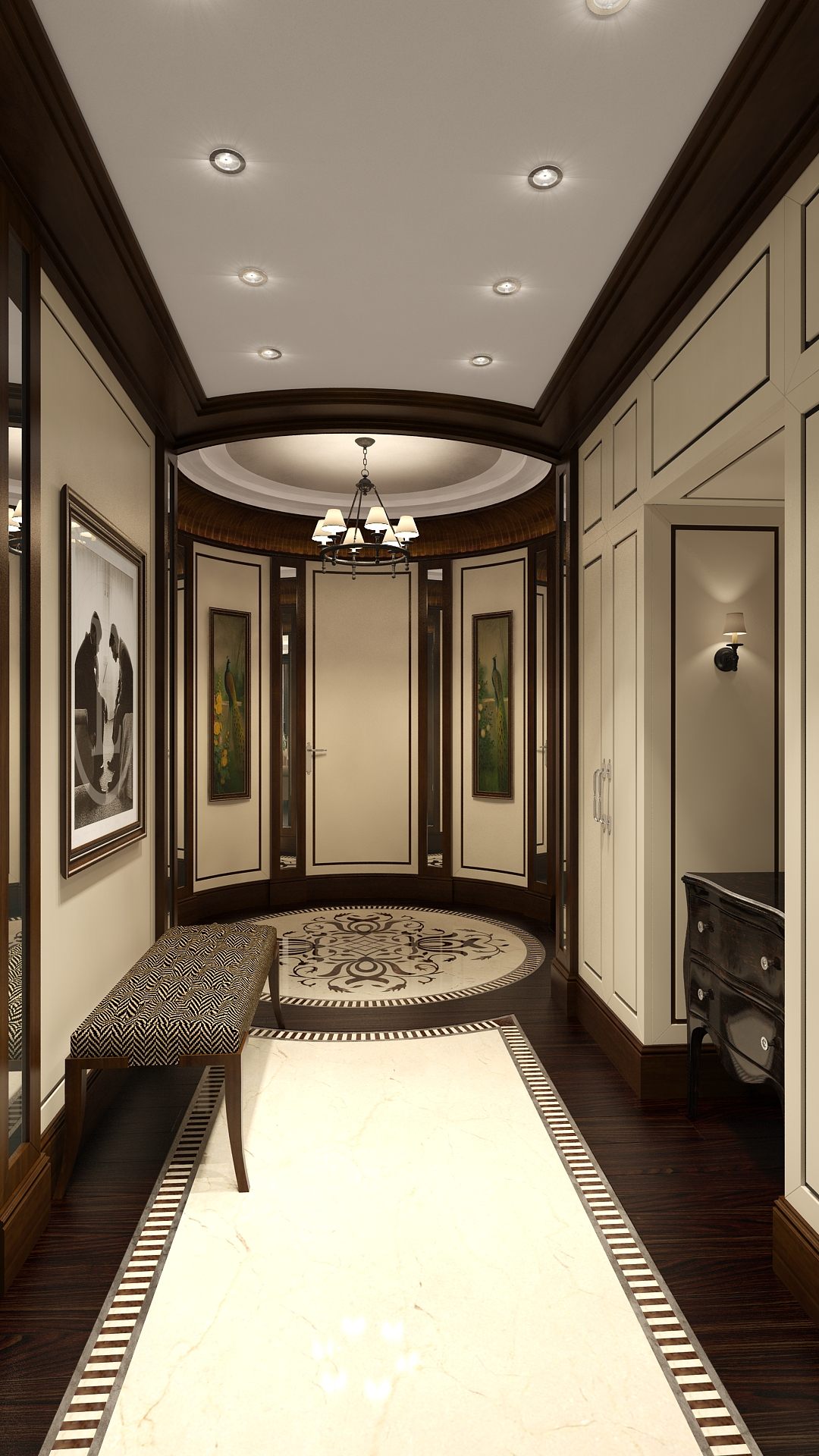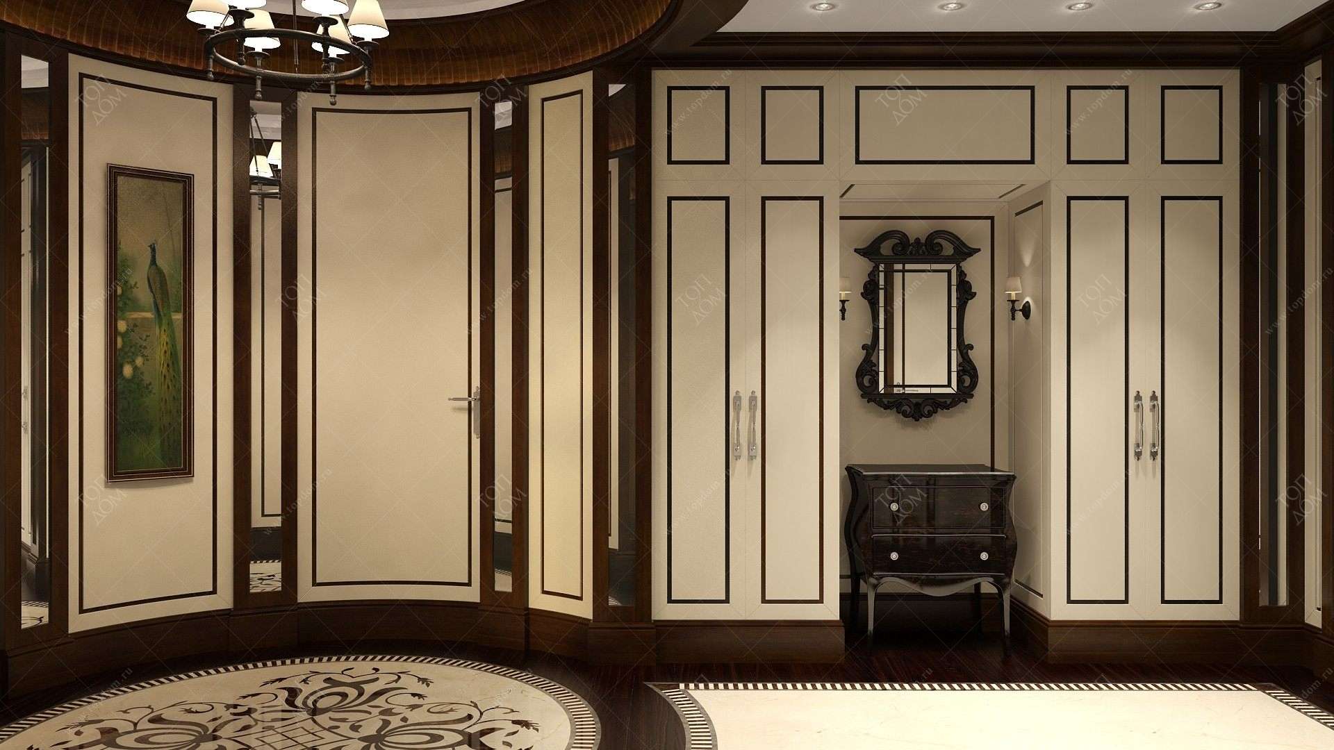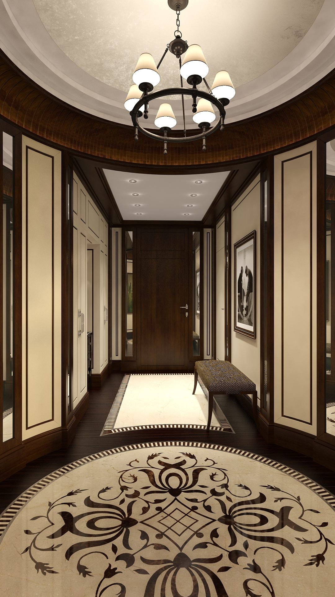 По планировке входная группа завершается круглым холлом – это решение дублируют напольное панно из мраморной плитки с инкрустацией и потолочная ниша с высоким деревянным карнизом. Самая осветленная поверхность в прихожей – белый потолок – делает более отчетливым привлекательный контраст коричнево-бежевой отделки.