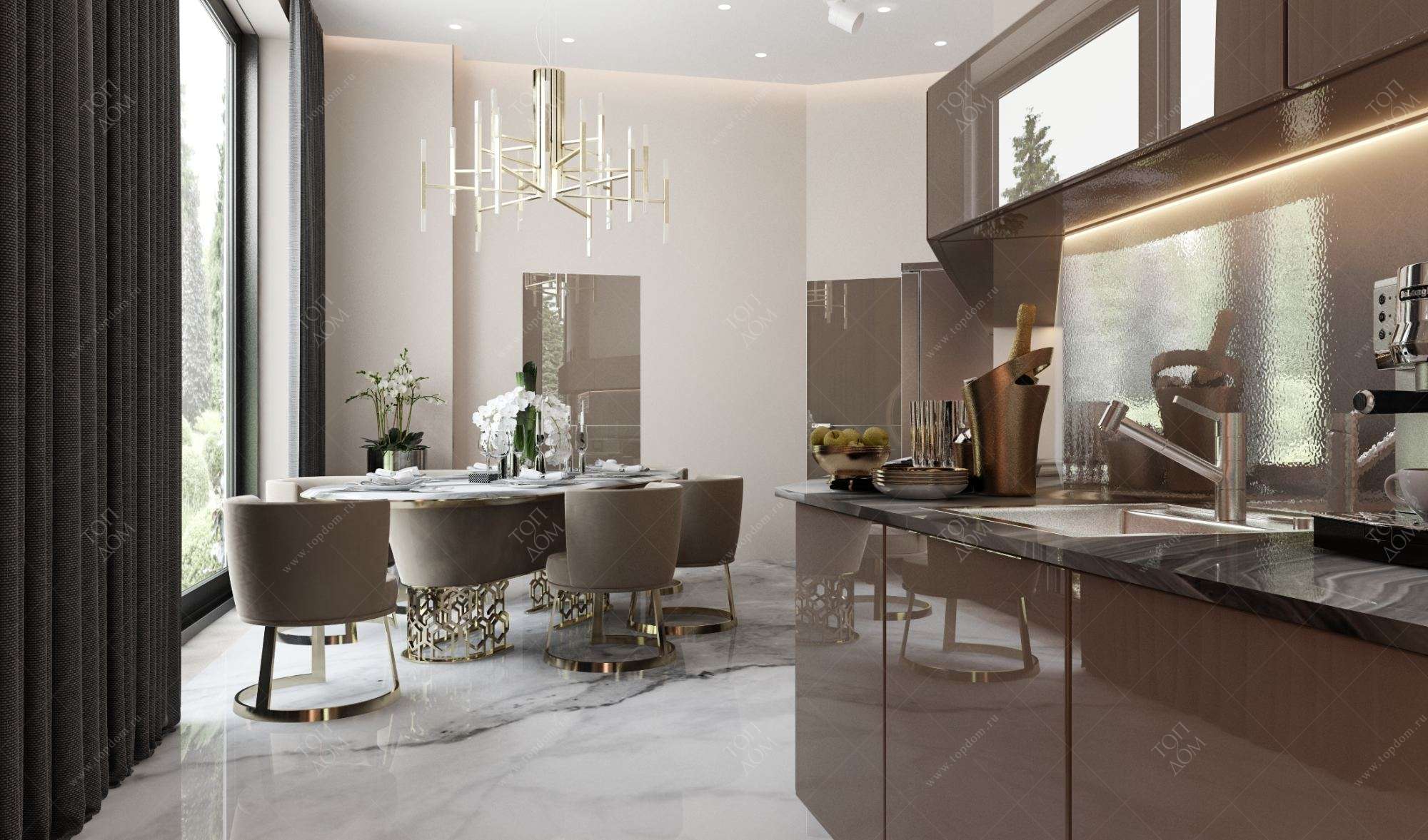 2. Дизайн-проект кухни в нейтральных цветах – пример того, как роскошно и современно может выглядеть мебель мокко в интерьере. Глянцевые фасады шкафов образуют цельную композицию с такими же по колеру мягкими полукреслами и настенными декоративными панелями. Золотистые опоры кресел и обеденного стола – гламурный штрих.