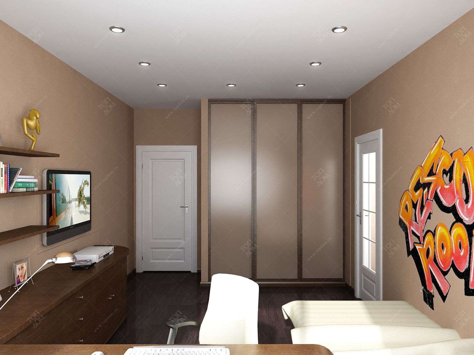 10. В варианте уютной комнаты подростка из проекта семейного интерьера квартиры мы предлагаем использовать мягкий коричневый для окрашивания стен и шкафа-купе. Такой фон не утомляет глаза, не отвлекает от выполнения домашних заданий и в то же время позволяет сделать яркий акцент в виде граффити.