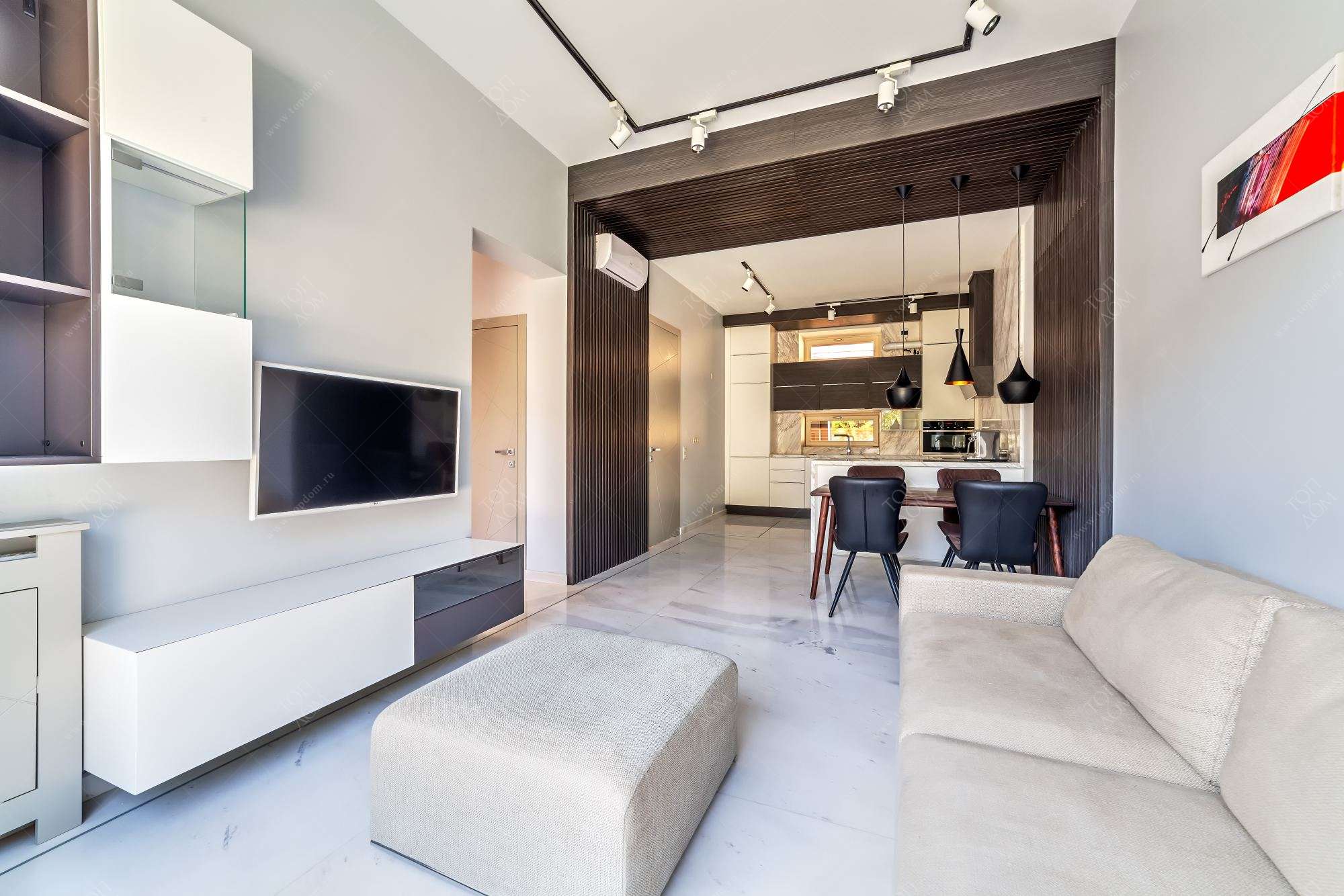 Для оформления гостиной, холла и прихожей квартиры выбрано элегантное сочетание темных коричневых тонов и светлого оттенка слоновой кости. Создаваемый ими контраст позволяет легко выделить нужные детали, в то же время он не такой резкий, как черно-белый вариант.