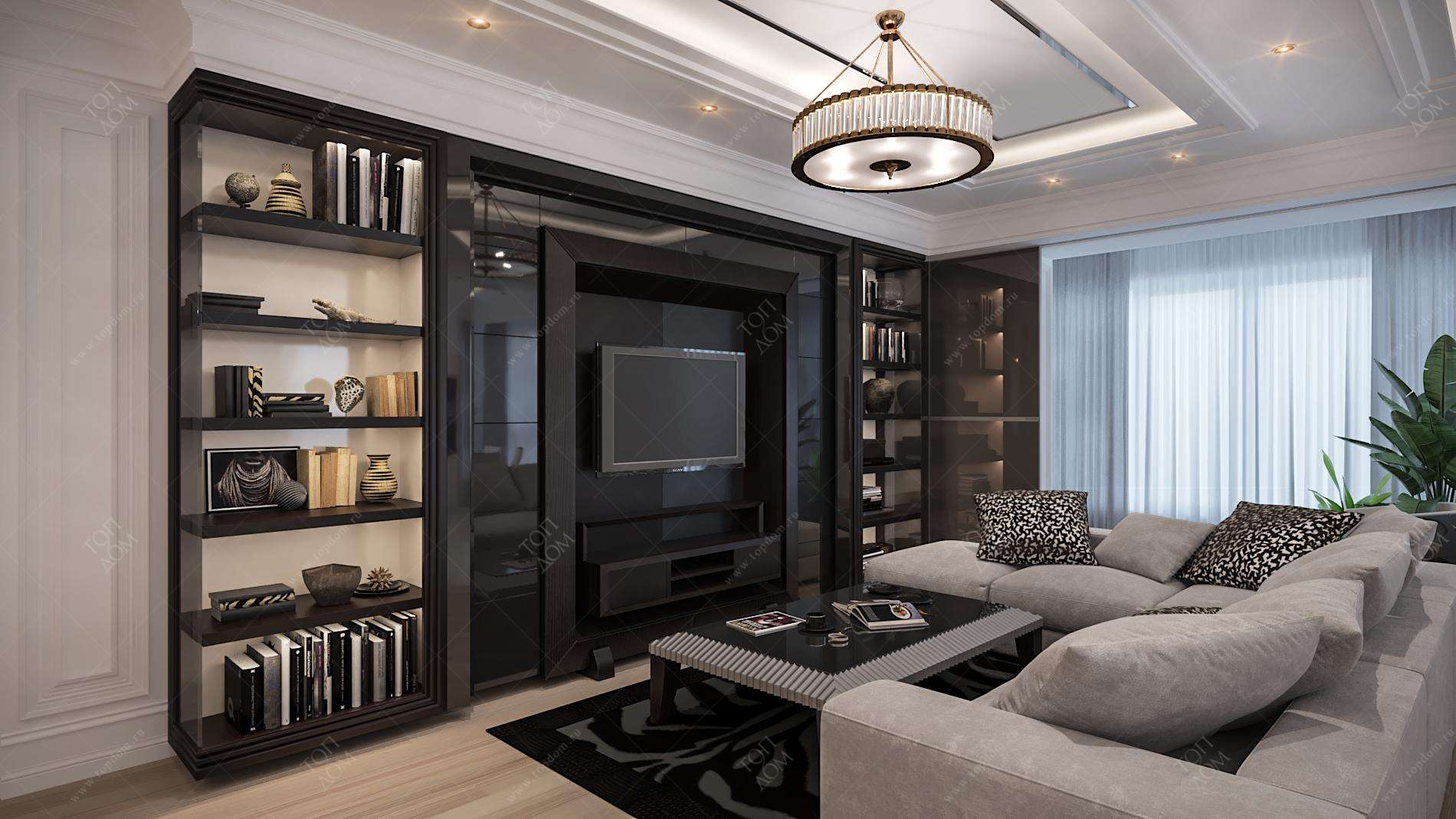 4. Для гостиной из проекта красивого дизайна квартиры смоделирована объемная стенка в ТВ-зоне. Матовое дерево темно-каштанового оттенка в нише с телевизором дополнено глянцевыми вставками и открытыми полками с подсветкой.