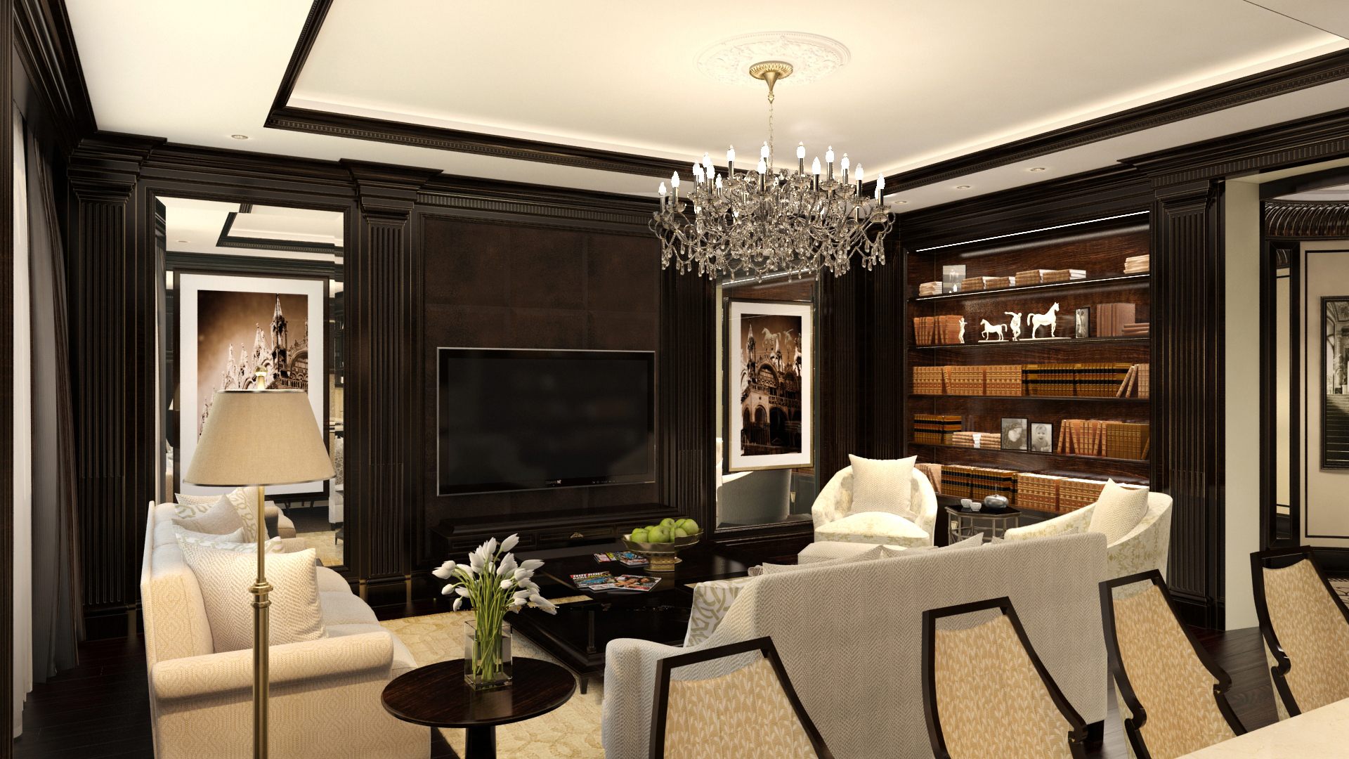 Использование темного дерева продолжено в гостиной: стеновая обшивка комбинируется с резными пилястрами, рельефными фризами, внутренней панелью книжного стеллажа. Красивый оттенок мокко вводится также меблировкой – журнальным столиком, тумбой в ТВ-зоне, декоративными круглыми консолями.