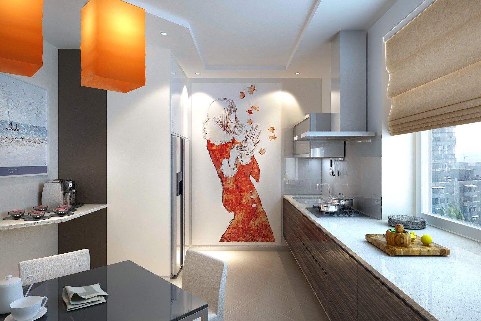 Зона кухни в интерьере студии размещается вдоль окна, холодильник – за перегородкой, с внешней стороны которой крепится небольшой кофейный столик.