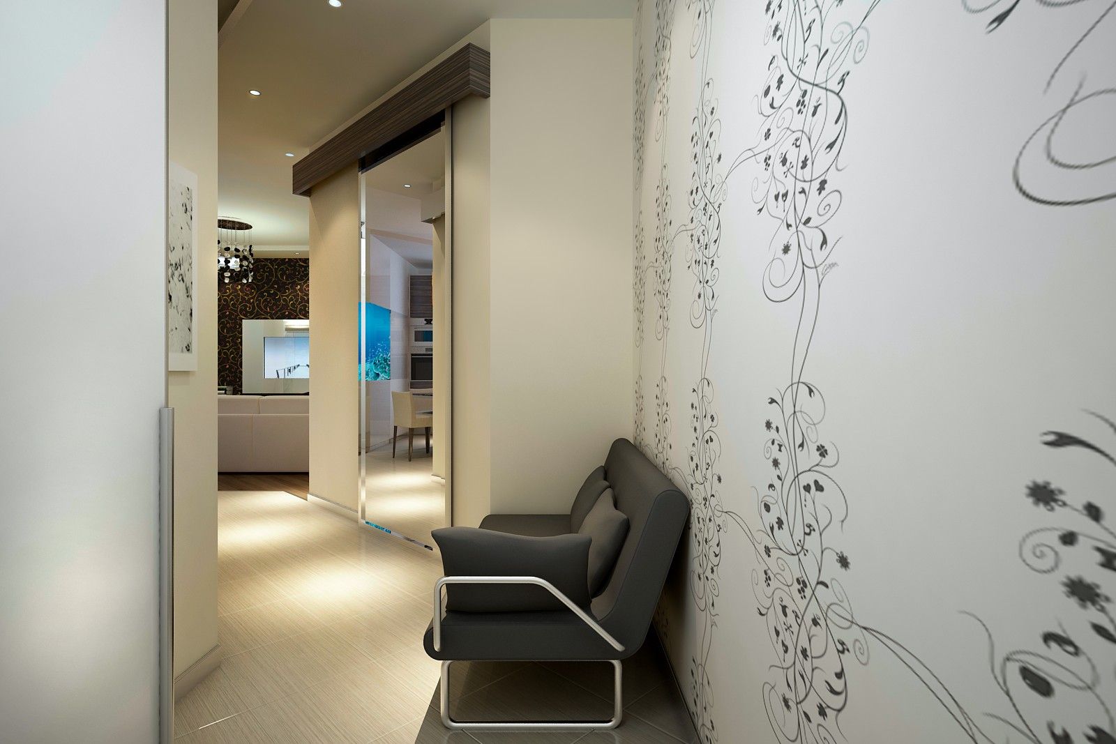 Столовая и коридор располагаются относительно гостиной по диагонали, что дает возможность обустроить в коридоре необходимые шкафы-купе. Их зеркальные двери раздвигают объем помещения. В столовой эту задачу выполняет зеркальная поверхность стены, расположенной напротив обеденного стола.
