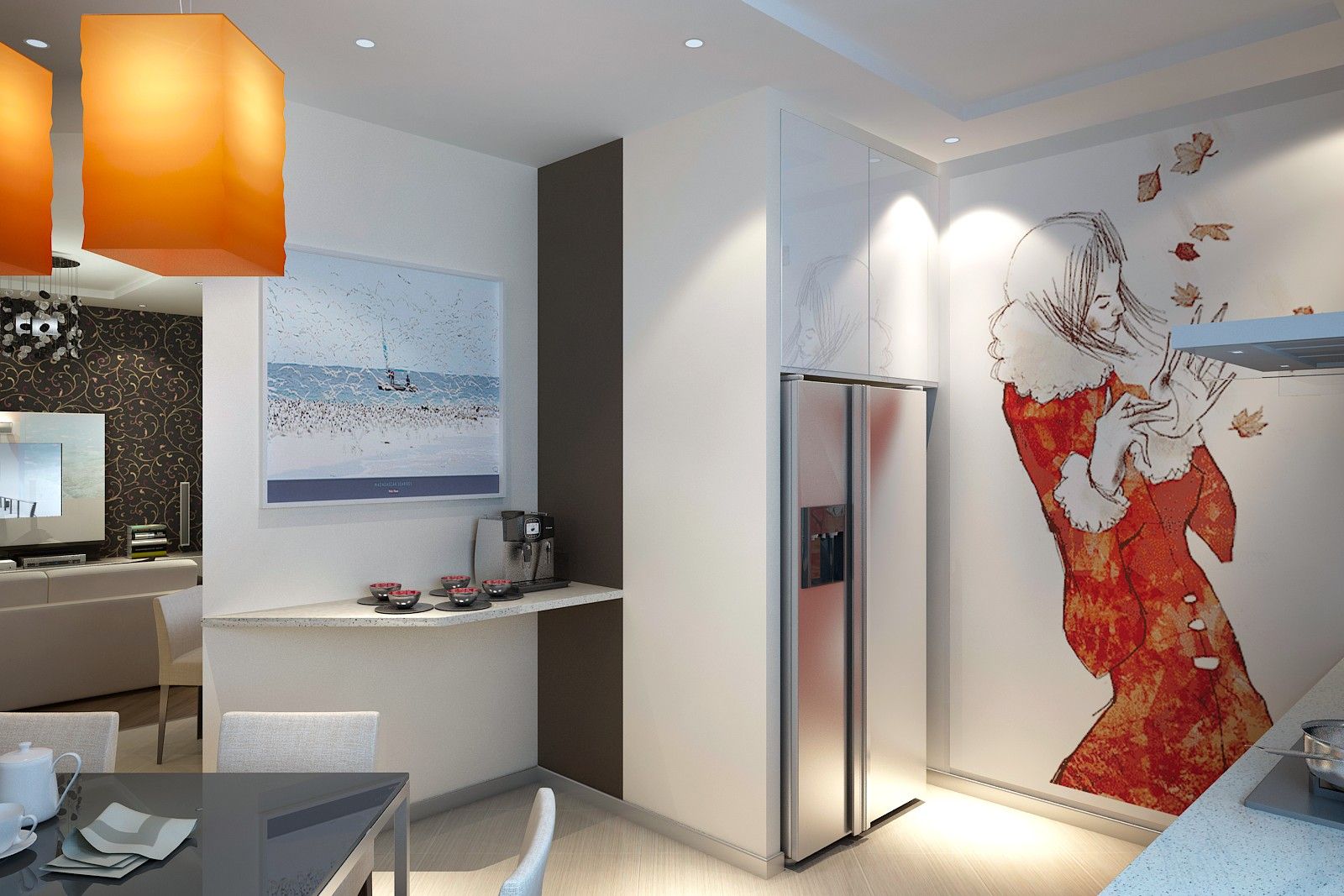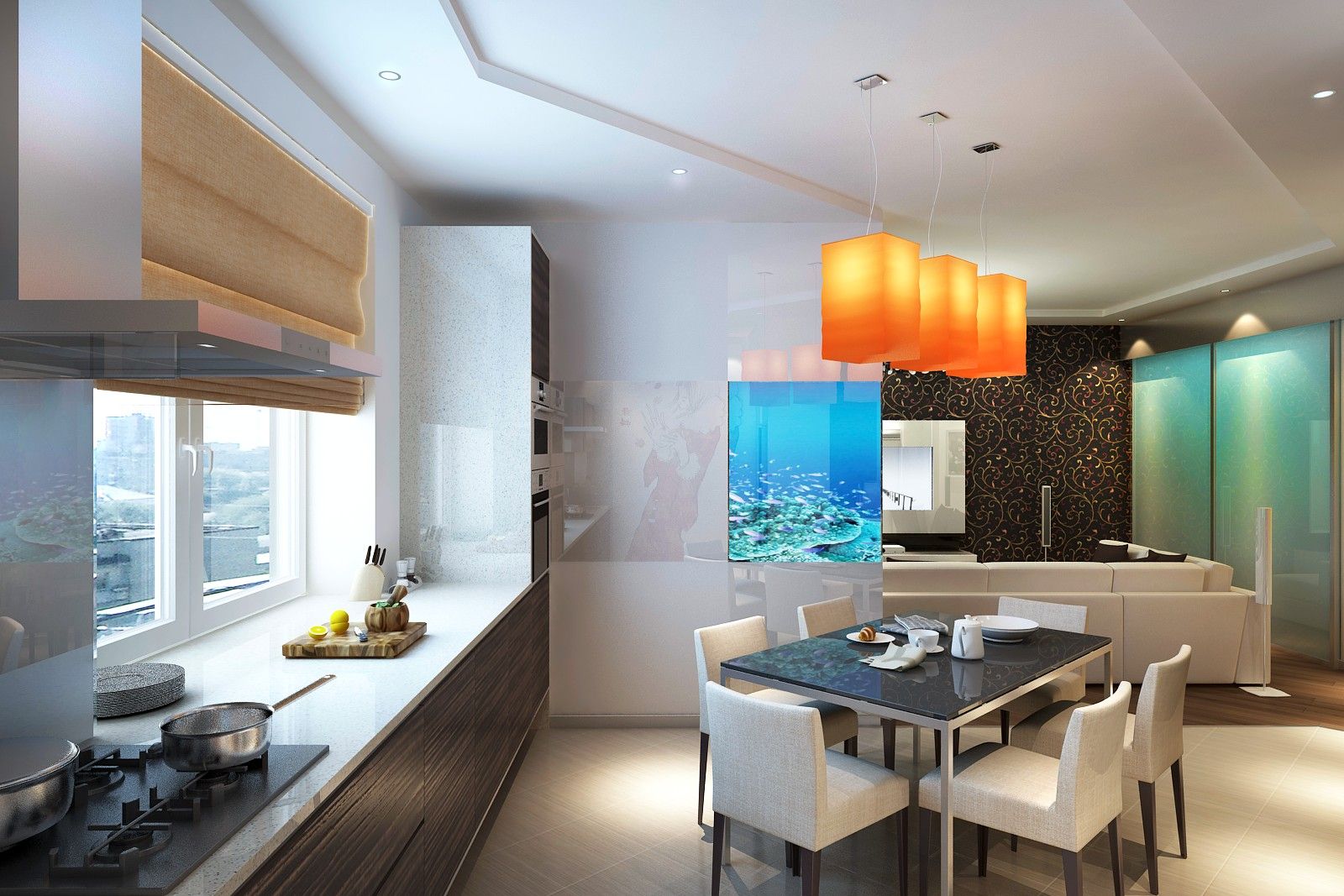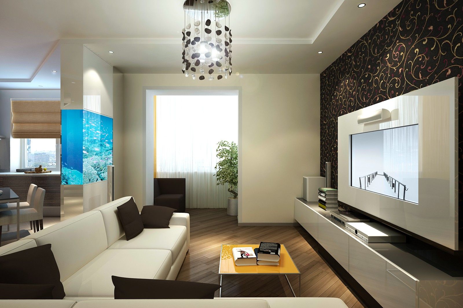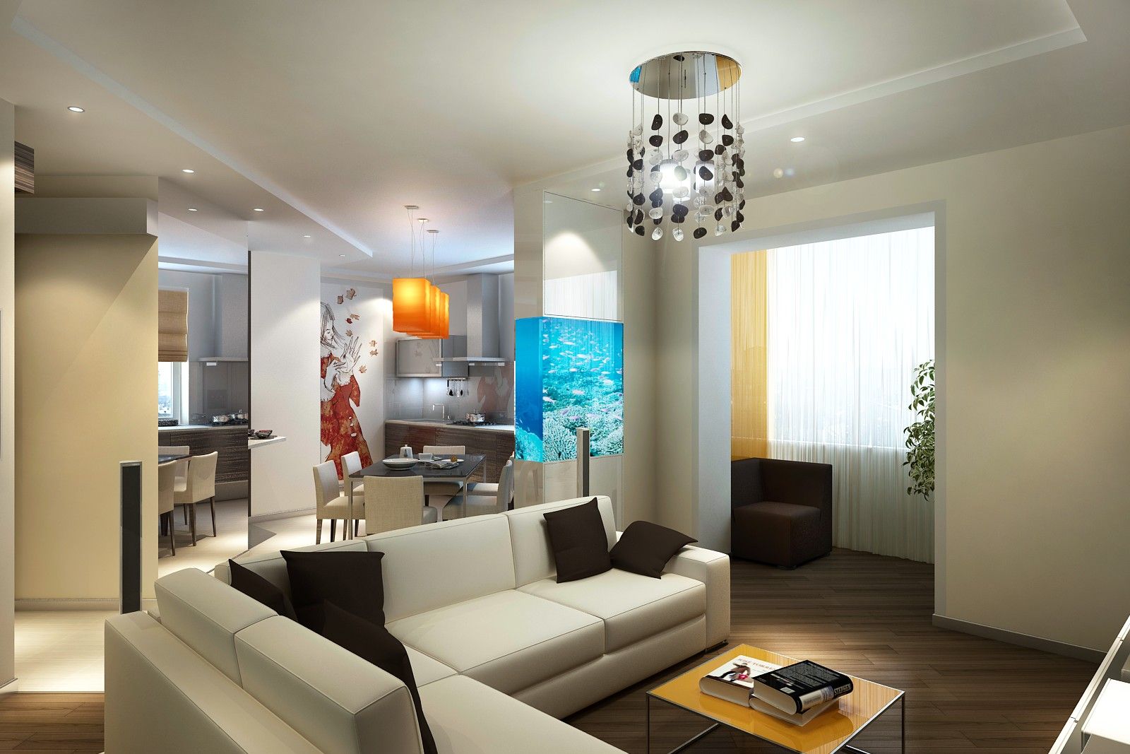 В перегородку, отделяющую столовую от гостиной, вмонтирован аквариум, что позволило не выделять для него дополнительную площадь.
