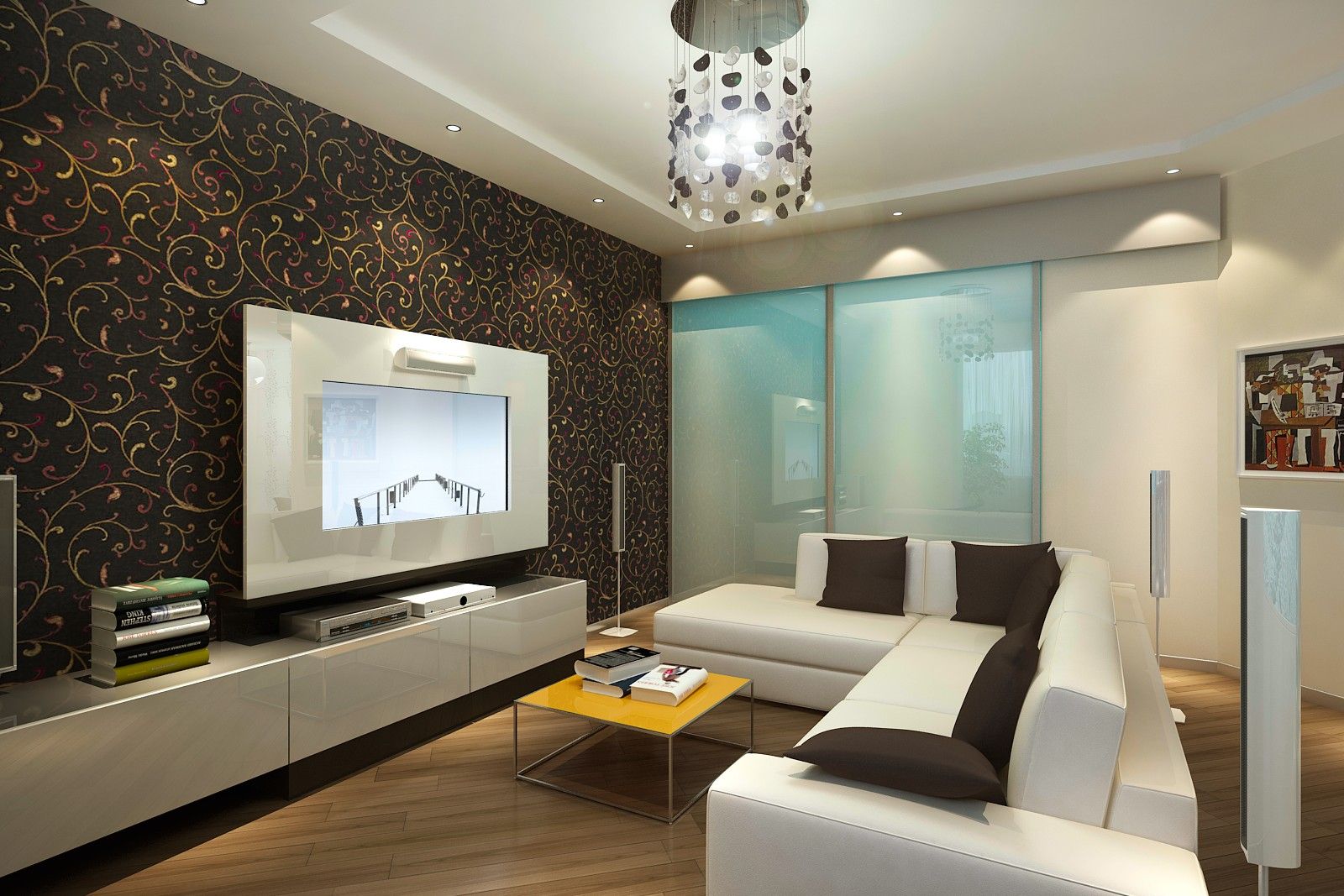 Стена за плазменной панелью в интерьере гостиной студии отделана обоями густого шоколадного оттенка. Этот же цвет повторяется в оформлении диванных подушек, столешницы обеденного стола, фасада кухонного гарнитура. Темный цвет выразительно играет на контрасте с молочными оттенками стен и потолка.