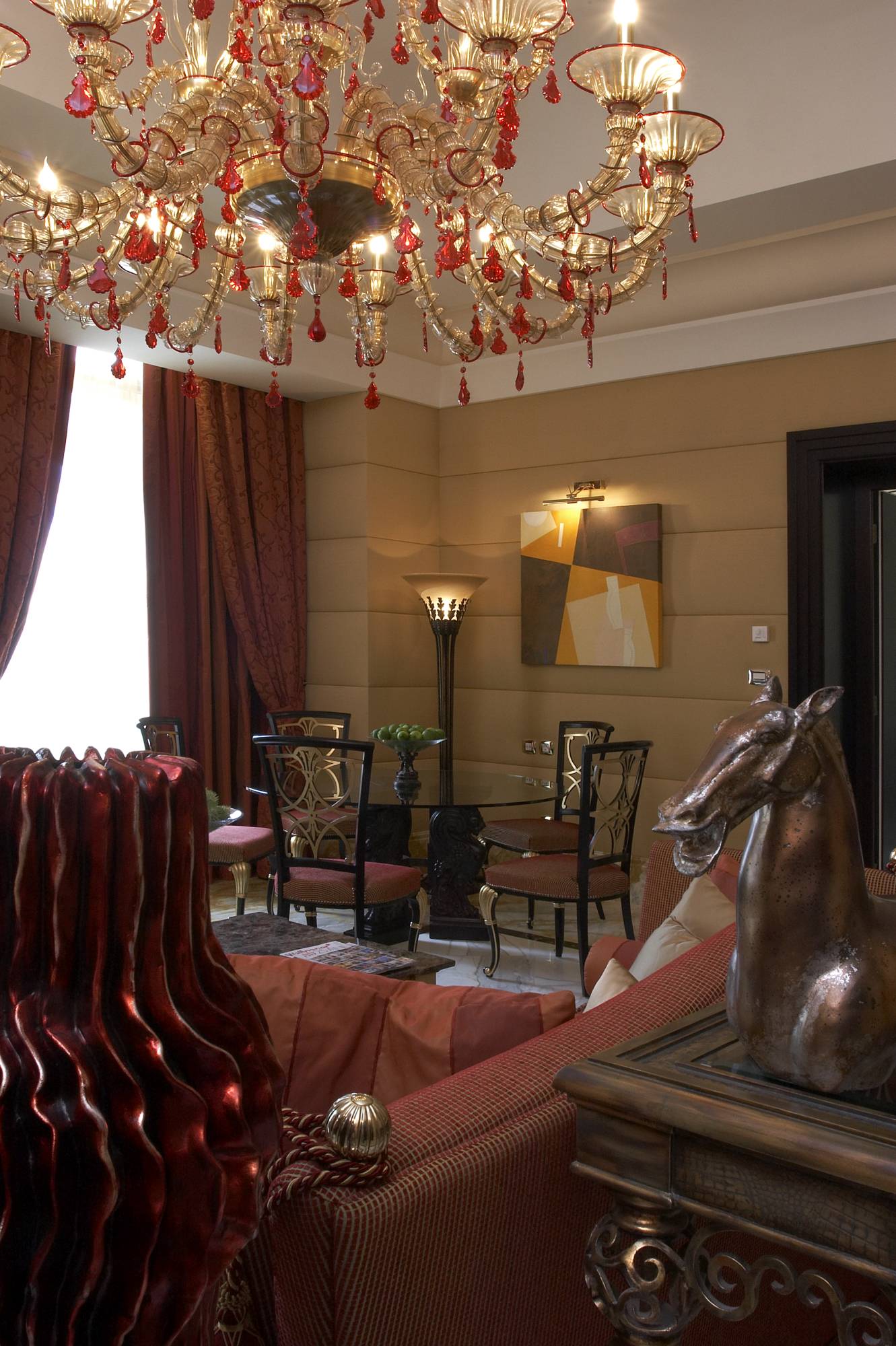 Стены обеих гостиных и столовой облицованы мягкими кожаными панелями светло-песочного оттенка. Это создает ощущение уюта, а еще теплый фон для цветовых акцентов. В интерьере первой гостиной такими акцентами стала терракотовая обивка дивана и кресел, оконных портьер, красные подвески люстры, молочно-белые мягкие панели комода. Дизайн межкомнатных дверей, изготовленных из венге, повторяет раскладку стеновых панелей, превращаясь в их органичное продолжение. Пол покрывает серо-бежевая плитка под мрамор, на стенах она переходит в широкий плинтус.