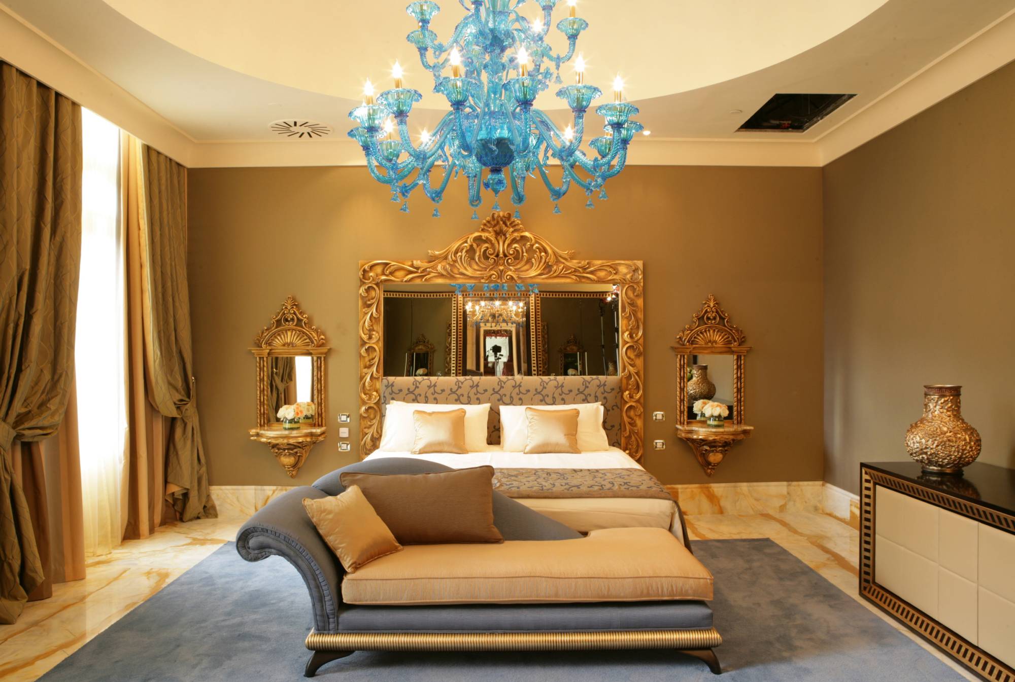 Интерьер элегантной спальни, примыкающей ко второй гостиной, акцентирован ярко-голубой люстрой и серо-голубым цветом оттоманки и ковра с коротким ворсом. Гладкие стены окрашены в насыщенный коричневый оттенок, на фоне которого роскошно смотрятся резные патинированные рамы большого зеркала в изголовье кровати и декоративных зеркал с полочками, развешанных по бокам.