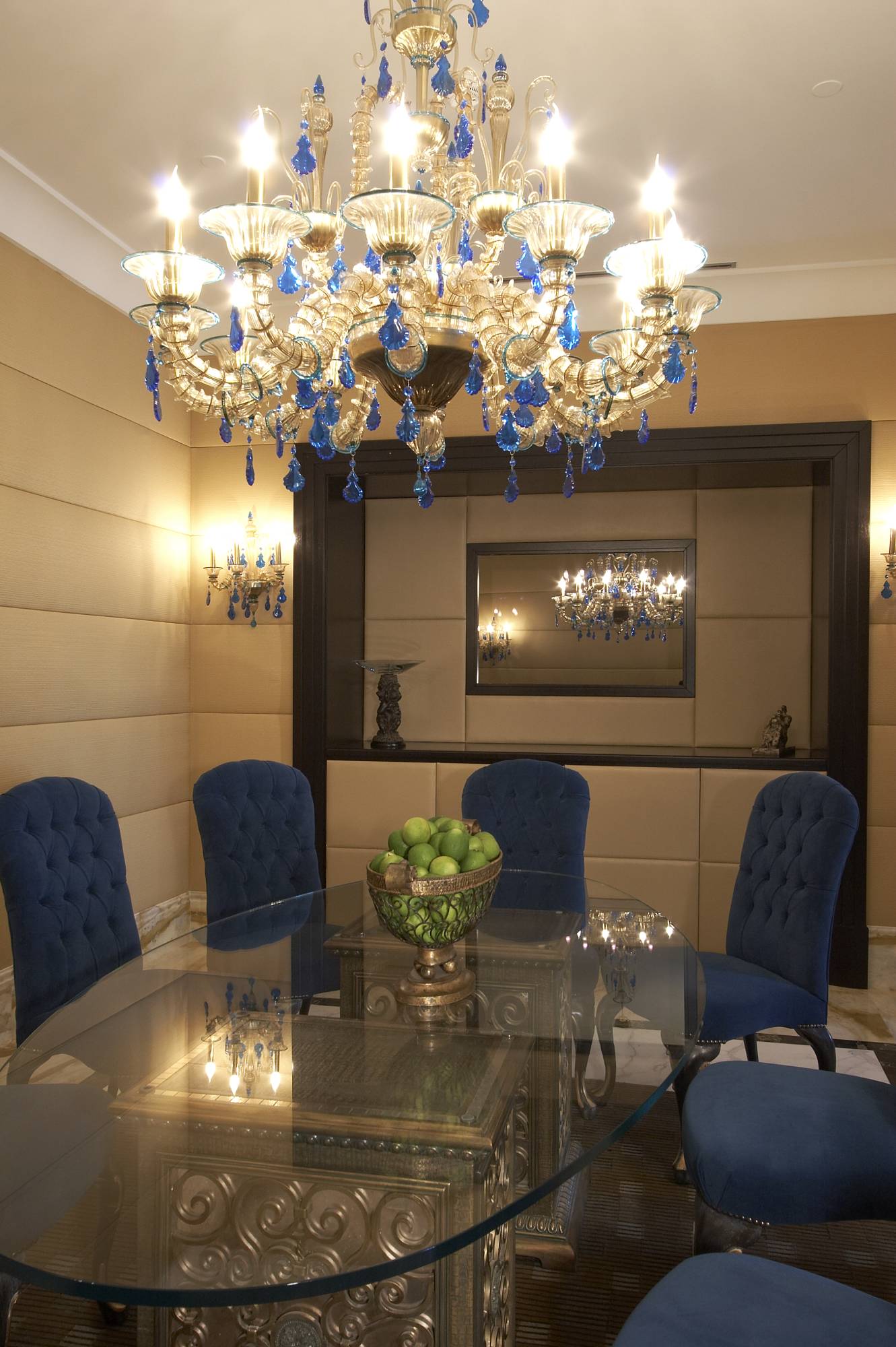 Изящная столовая объединена с гостиной двумя проходами. Основным источником освещения здесь является такая же люстра, как в гостиной. Насыщенный серо-синий цвет в прекрасном интерьере задает обивка мягких стульев с простежкой капитоне. Овальный обеденный стол с прозрачной столешницей покоится на массивных кубических подстольях, украшенных резьбой. В торцевой стене сделана неглубокая ниша для телевизора.