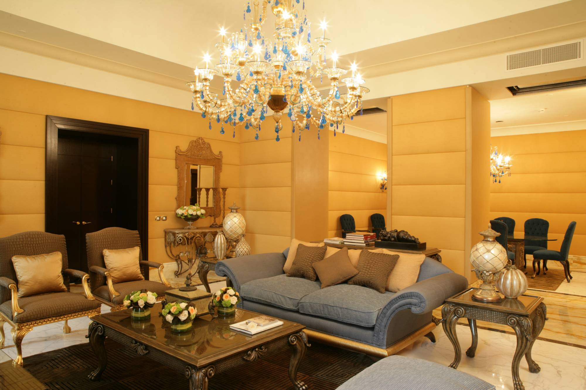 В интерьере второй гостиной цветовые акценты сделаны серо-голубой обивкой дивана и пуфа, синими подвесками светильника, ковром цвета темного состаренного металла. Изогнутые деревянные ножки столов и кресел имитируют звериные лапы, настенные зеркала оформлены в широкие резные рамы. За спинкой дивана организована небольшая рабочая зона с узким столиком и мягким стеганым креслом с деревянными подлокотниками.