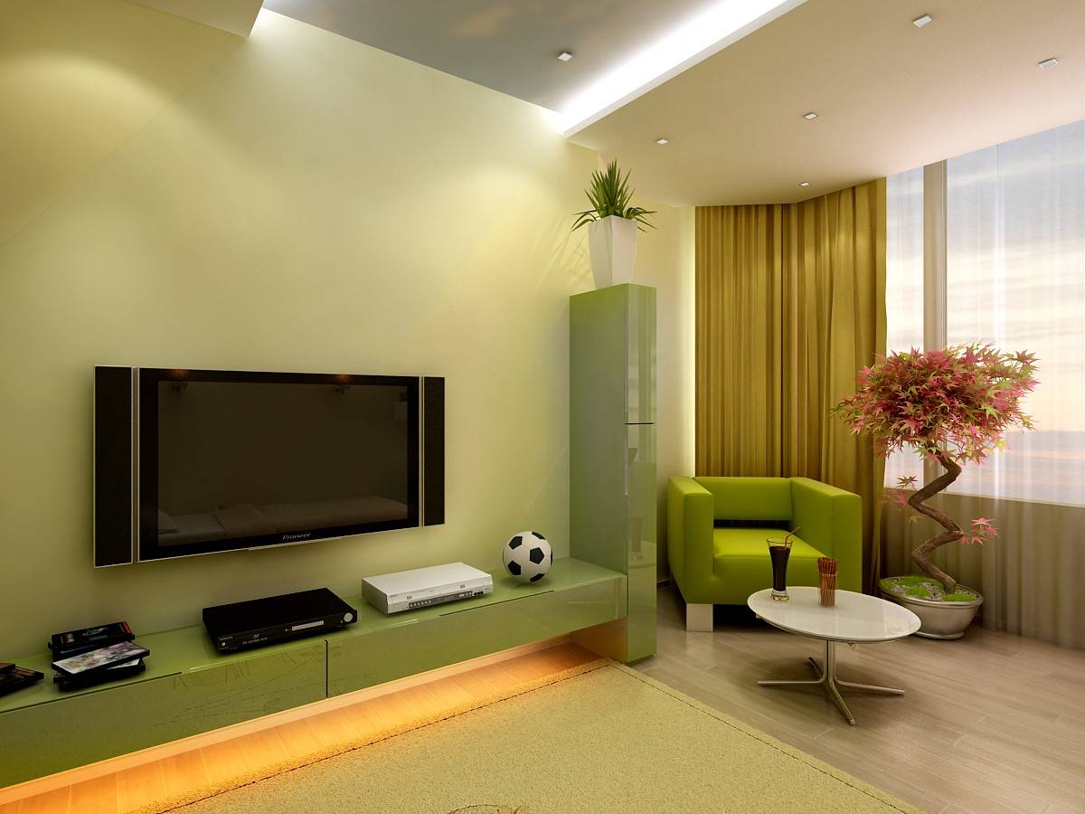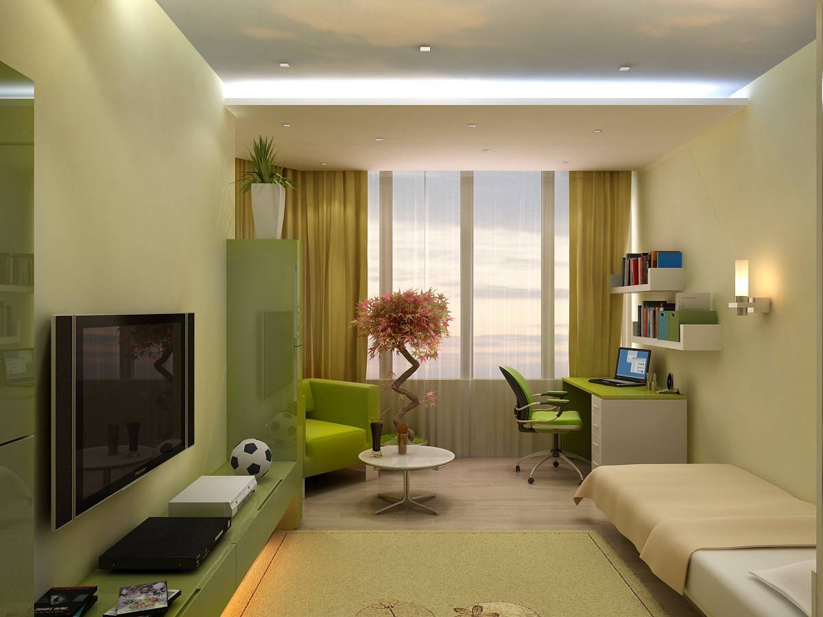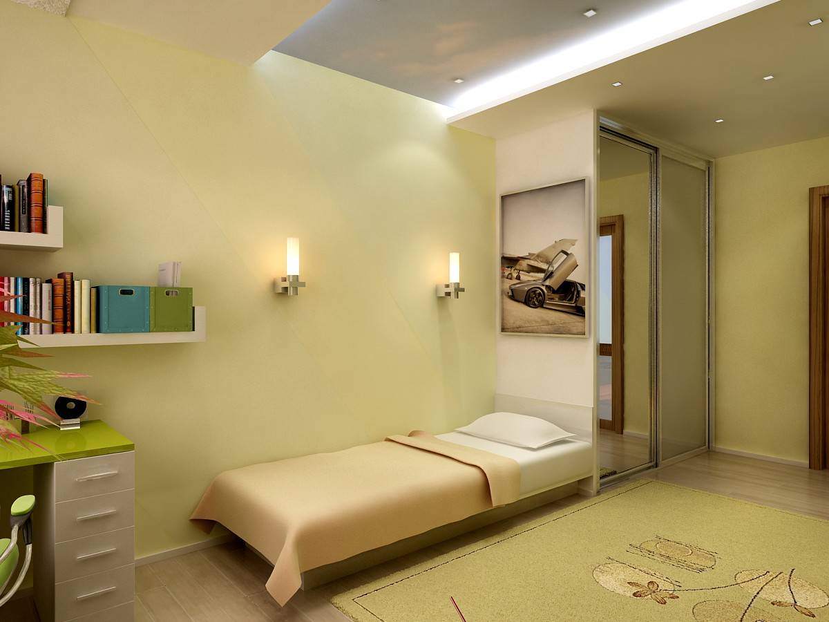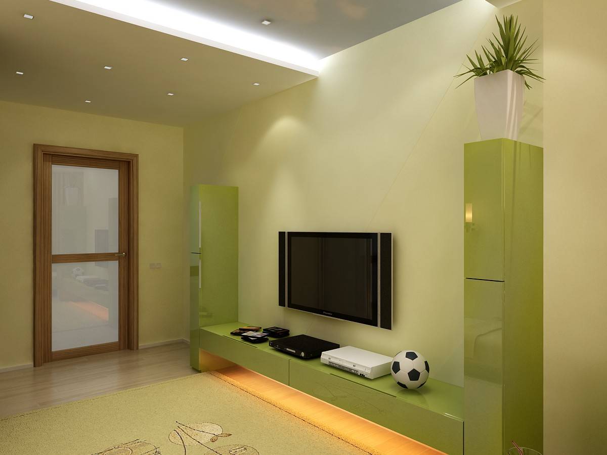 Фисташковые и оливковые оттенки стали основой цветового оформления интерьера детской комнаты. На потолке здесь симметрично расположены подвесные конструкции, между которыми проступает поверхность, расписанная в виде неба.