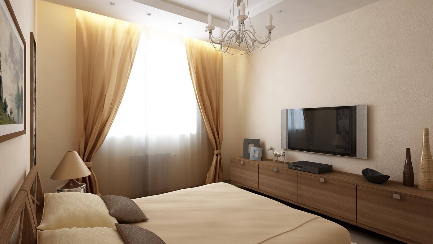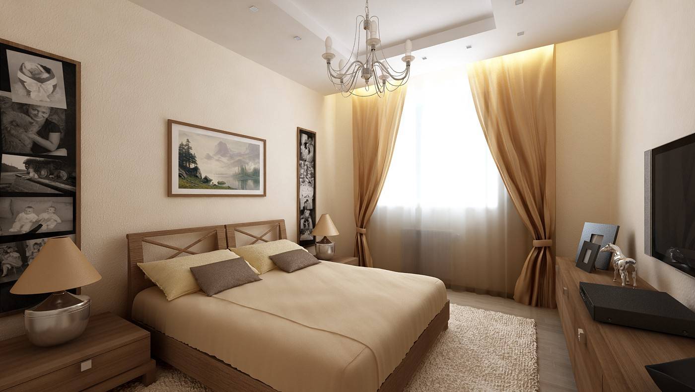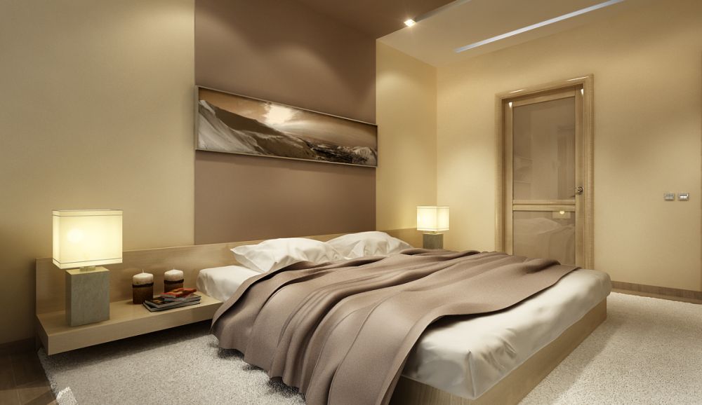 Разные оттенки коричневого позволили акцентировать отдельные зоны в спальной комнате. Стена за изголовьем покрашена в густой кофейный цвет, переходящий на потолок. Ярким образным элементом в простом дизайне второй спальни стали фотоколлажи, развешенные по обеим сторонам от кровати.