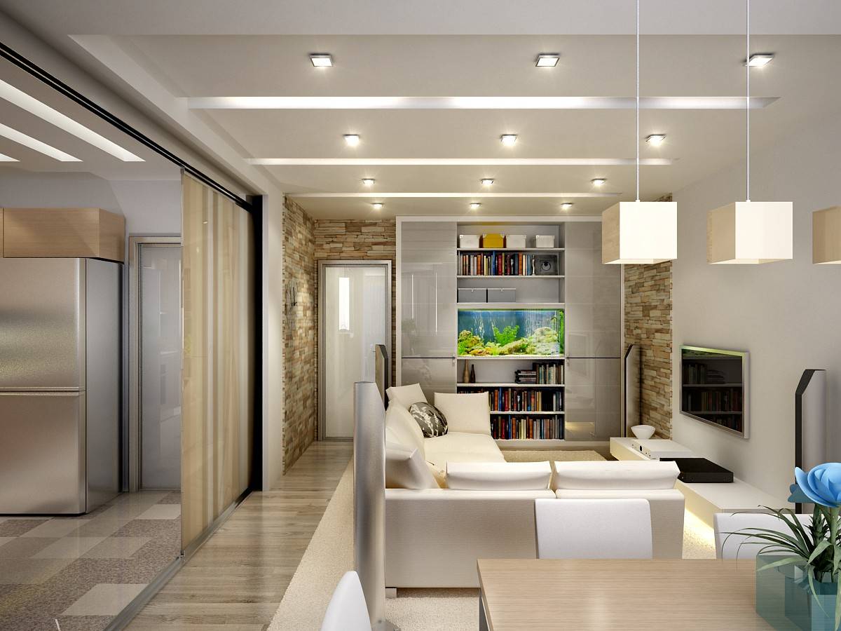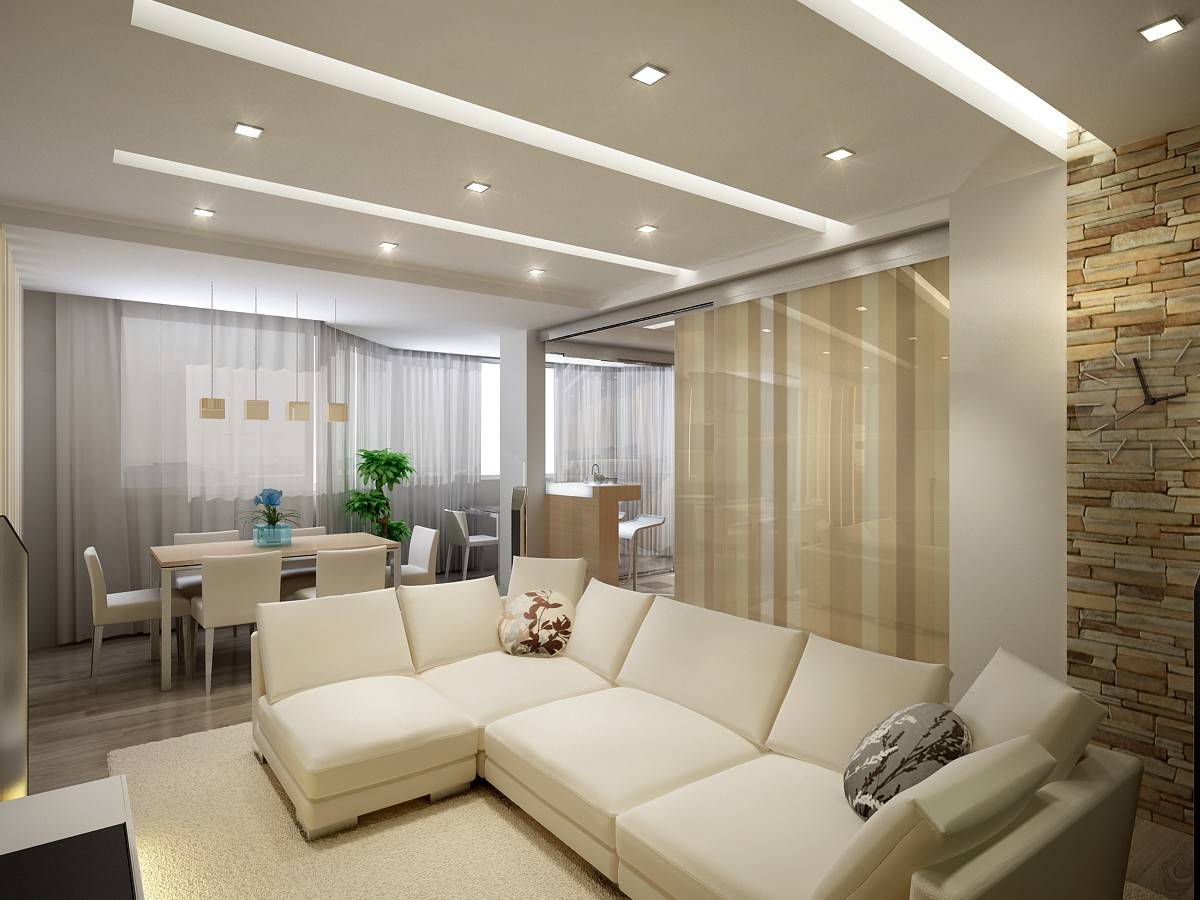 Гостиную от кухни отделяет широкая раздвижная перегородка из цветного стекла. Нанесенный на стекло рисунок из вертикальных полос зрительно увеличивает высоту помещения, а разные оттенки коричневой гаммы органично вписывают объект в колористику интерьера – с бежевыми и песочными тонами. Выбранные теплые тона повторяются в декоративном камне, которым отделана часть стен при входе в гостиную.