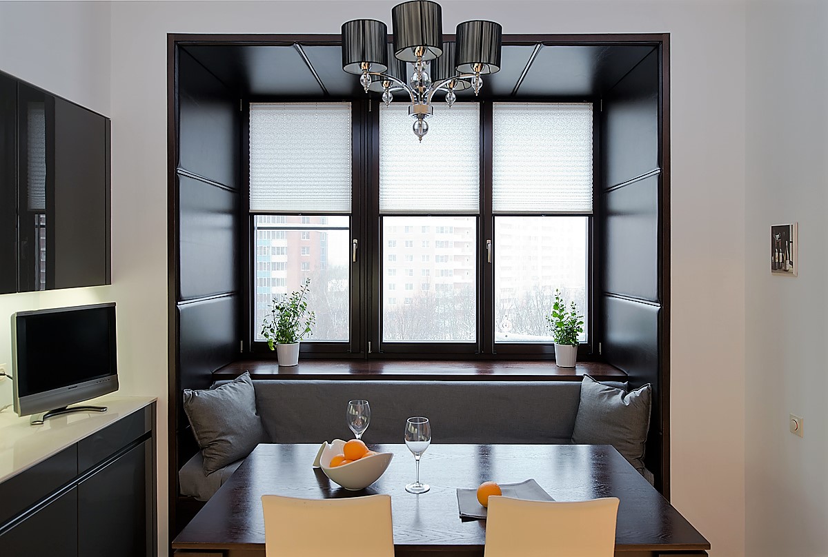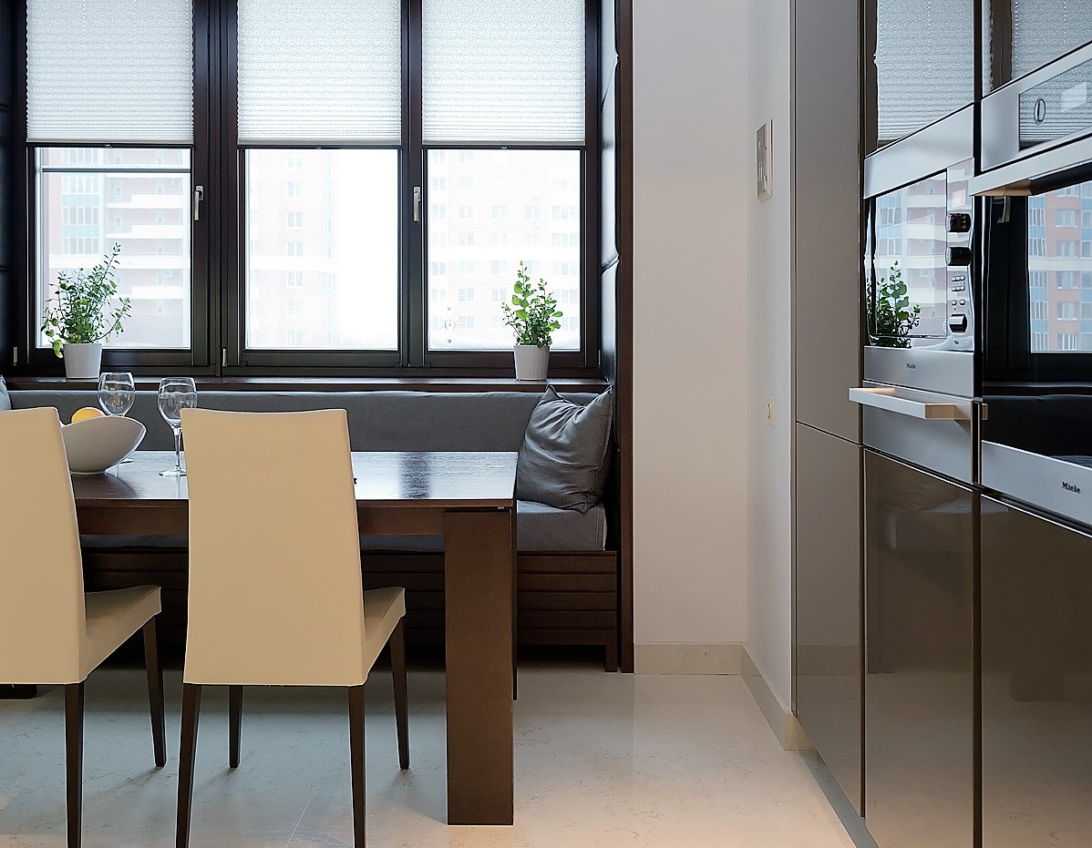 Коричневая кухня с кремовыми стульями и серым диванчиком