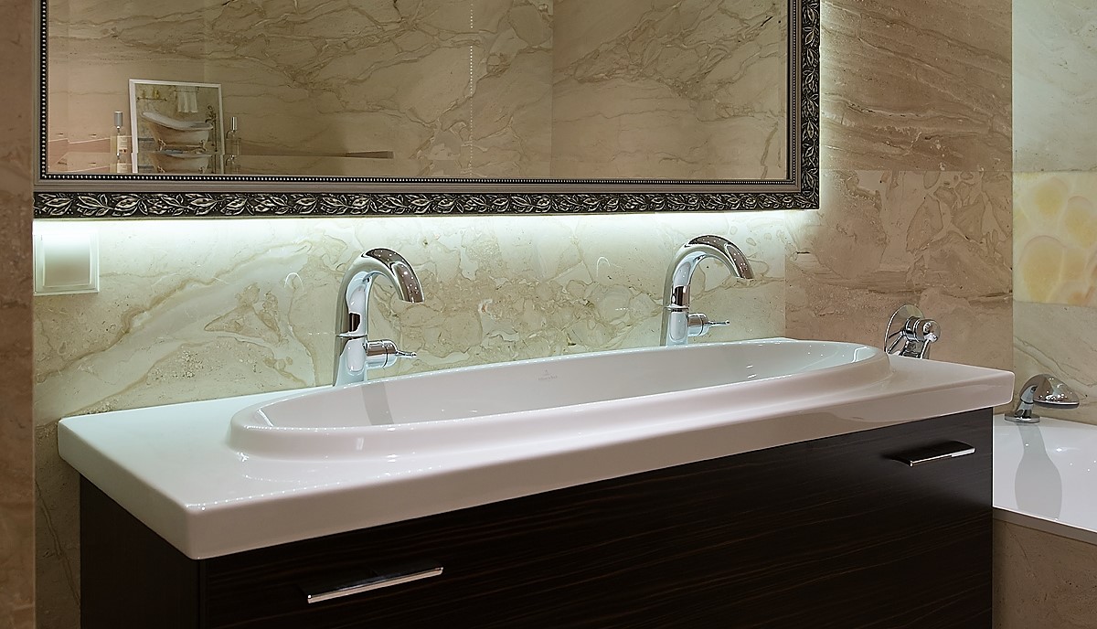 Белая овальная раковина с 2 кранами в дизайне санузла